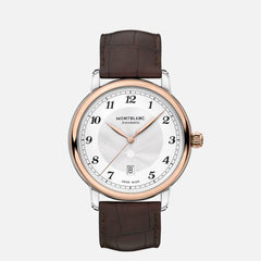 In celebration of the 20th anniversary of the Montblanc’s Star Collection this year, the Maison reinvents its iconic collection with timepieces inspired by the extraordinary patrimony of the Minerva Manufacture, reinterpreting both the collection’s aesthetics and technology. The Star Legacy Automatic Date is the purest timepiece of the collection. It displays all the design codes of the line, including a refined dial featuring the Montblanc iconic exploding star guilloché pattern, leaf-shaped hours and minutes hands, redesigned Breguet-style Arabic numerals reminiscent of the historical Minerva pocket watches, a filet sauté (up and down guilloché lines), a unique railway minute track and a seconds hand with the Montblanc emblem at its tip. The watch is housed in a 42 mm steel and gold case, features a silvery-white dial, and comes with a brown alligator leather strap crafted by the Montblanc Pelletteria in Florence, Italy.