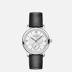 Inspired by the extraordinary Minerva heritage that dates back to 1858, Montblanc introduces ladies' timepieces within its Star Legacy Collection, combining femininity with the spirit of classical fine watchmaking. The Montblanc Star Legacy Small Second features a 36 mm stainless steel case with a curved finish on the sides, giving it a refined shape and pebble effect, along with horns that have steps on the sides. In the spirit of classical watchmaking, the crown stands out with its recognizable and easy-to-grip onion shape, adorned on the side with the iconic Montblanc emblem in mother-of-pearl. The silvery-white dial features the Maison’s exploding star guilloché pattern in the center and is highlighted by prominent anthracite-colored Arabic numerals at 3, 9 and 12 o’clock. At 6 o’clock, an elegant diamond ring encircles the small seconds counter set with 32 diamonds (~0.064 ct) and containing a smaller Montblanc exploding star guilloché pattern. The timepiece is completed with a new dark gray sfumato alligator leather strap from the Montblanc Pelletteria in Florence, Italy.