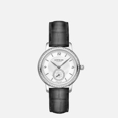Inspired by the extraordinary Minerva heritage that dates back to 1858, Montblanc introduces ladies' timepieces within its Star Legacy Collection, combining femininity with the spirit of classical fine watchmaking. The Montblanc Star Legacy Small Second features a 32 mm stainless steel case with a curved finish on the sides, giving it a refined shape and pebble effect, along with horns that have steps on the sides. The bezel is set with 68 diamonds (~0.5032 ct), bringing the utmost refinement. In the spirit of classical watchmaking, the crown stands out with its recognizable and easy-to-grip onion shape, adorned on the side with the iconic Montblanc emblem in mother-of-pearl. The silvery-white dial features the Maison’s exploding star guilloché pattern in the center and is highlighted by prominent anthracite-colored Arabic numerals at 3, 9 and 12 o’clock. At 6 o’clock, an elegant diamond ring encircles the small seconds counter set with 28 diamonds (~0.056 ct) and containing a smaller Montblanc exploding star guilloché pattern. The timepiece is completed with a new dark gray sfumato alligator leather strap from the Montblanc Pelletteria in Florence, Italy.