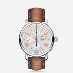 The Montblanc Star Legacy product line takes its inspiration from Minerva’s heritage and the company’s pocket watches, made during the late 19th and early 20th centuries. The Montblanc Star Legacy Chronograph Day & Date offers useful complications and classical watchmaking along with a stylish, yet casual look. It comes in a 43 mm stainless steel case and features an ivory-colored dial with 18 K rose gold-coated Roman numerals, indexes and luminescent hands for the time functions and blued hands for the chronograph readings. The timepiece is equipped with the MB 25.07 chronograph movement that indicates the elapsed seconds via a central chronograph seconds hand, the elapsed minutes in a 30-minute counter, and the elapsed hours in a 12-hour counter. The day and date displays can be found in apertures at 3 o’clock.