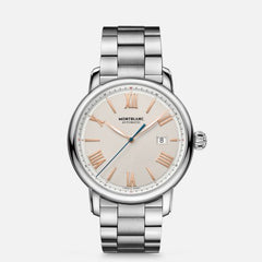 The Montblanc Star Legacy product line takes its inspiration from Minerva’s heritage and the company’s pocket watches, made during the late 19th and early 20th centuries. The Montblanc Star Legacy Automatic Date offers useful indications and classical watchmaking along with a stylish, yet casual look. It comes in a 43 mm stainless steel case and features an ivory-colored dial with 18 K rose gold-coated Roman numerals, indexes and luminescent hands. The timepiece is completed with a stainless steel 3-link bracelet that has been partly polished and partly satin-finished.