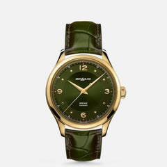 Inspired by historical Minerva classic wristwatches from the 1940s and 1950s, the Heritage product line combines the elegance of watchmaking's past with today’s bold design codes and technology. The Montblanc Heritage Automatic comes in a 40 mm 18 K yellow gold case with a sophisticated lacquered British racing-green dial adorned with yellow gold-coated applied Arabic numerals, dots as indexes and hands that are enhanced with SuperLumiNova®. The Montblanc Heritage Automatic is powered by Montblanc’s MB 24.27 automatic movement and is equipped with a matching British racing-green Sfumato alligator strap.