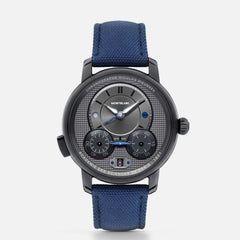 The Montblanc Star Legacy Nicolas Rieussec Chronograph 43mm Limited Edition pays tribute to the inking chronograph invention first tested by Nicolas Rieussec in 1821 in Paris and validated by the Académie des Sciences. This new iteration comes in a 43mm DLC-coated stainless steel case with a black dial. Clou de Paris motifs can be found on the dial, oscillating weight, and blue textile strap that are reminiscent of Paris's cobbled streets. Functions include a chronograph, day & night indication, second time zone, and a date. The timepiece is powered by the MB R200 Montblanc Manufacture monopusher chronograph movement and is limited to 500 pieces.