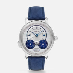 The Montblanc Star Legacy Nicolas Rieussec Chronograph 43mm pays tribute to the inking chronograph invention first tested by Nicolas Rieussec in 1821 in Paris and validated by the Académie des Sciences. This new iteration comes in a 43mm stainless steel case with a gray and blue dial. Clou de Paris motifs can be found on the dial, oscillating weight, and blue textile strap that are reminiscent of Paris's cobbled streets. Functions include a chronograph, day & night indication, second time zone, and a date. The timepiece is powered by the MB R200 Montblanc Manufacture monopusher chronograph movement.