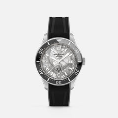 The Montblanc 1858 Iced Sea Automatic Date with gray glacier pattern dial gives the impression of looking into the depths of a glacier with all its minerals captured in time for millennia. Inspired by the Mer de Glace, this glacial texture was achieved using an almost-forgotten ancestral technique called gratté-boisé. The 41mm timepiece comes with a black interchangeable rubber strap with gray outline which can be quickly and easily switched for a stainless steel bracelet without the need to return to the boutique or the use of any tools. It is also adjustable on the wrist when wearing the watch for diving. The timepiece conforms to the ISO 6425 norm for scuba diving and comes with a water resistance of 300 meters and features luminescent markings for reading in low light.