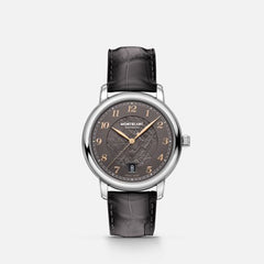 The Montblanc Star Legacy Grey Automatic Date Limited Edition of 1786 pieces comes in a 39mm stainless steel case that highlights a new facet of the Mont Blanc – its south-facing rocky side where the snow has difficulty to settle on its vertical face. This glacier gray pattern dial on this timepiece is highlighted with rose-gold-coated hands and Arabic numerals. Another nice touch is that the Montblanc emblem, on both the seconds hand and on the dial just about the date, cross paths every minute. The timepiece comes on an interchangeable gray calf leather strap with an alligator print.