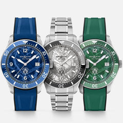 The Montblanc 1858 Iced Sea Automatic Date Coffret includes three Iced Sea editions in blue, green, and gray. Each model is different from standard editions as it features a colored laser engraving of mountains from the Mont-Blanc Massif. All three timepieces come in a decorative presentation case that has a granite-like base, representing the rock of the Mont Blanc Mountain, and a top that comes in Plexiglas® and has been laser engraved to show the relief of the Mont-Blanc Massif within. The coffret comes together with a stainless steel bracelet and three different interchangeable colored rubber straps. This limited edition coffret of 191 pieces is available exclusively in Montblanc boutiques.