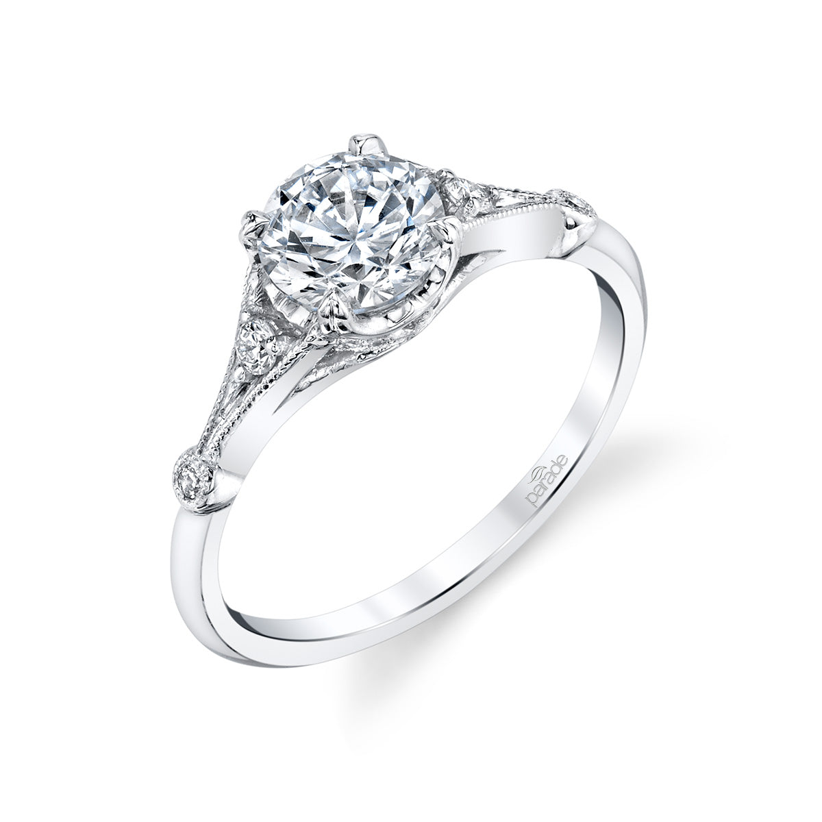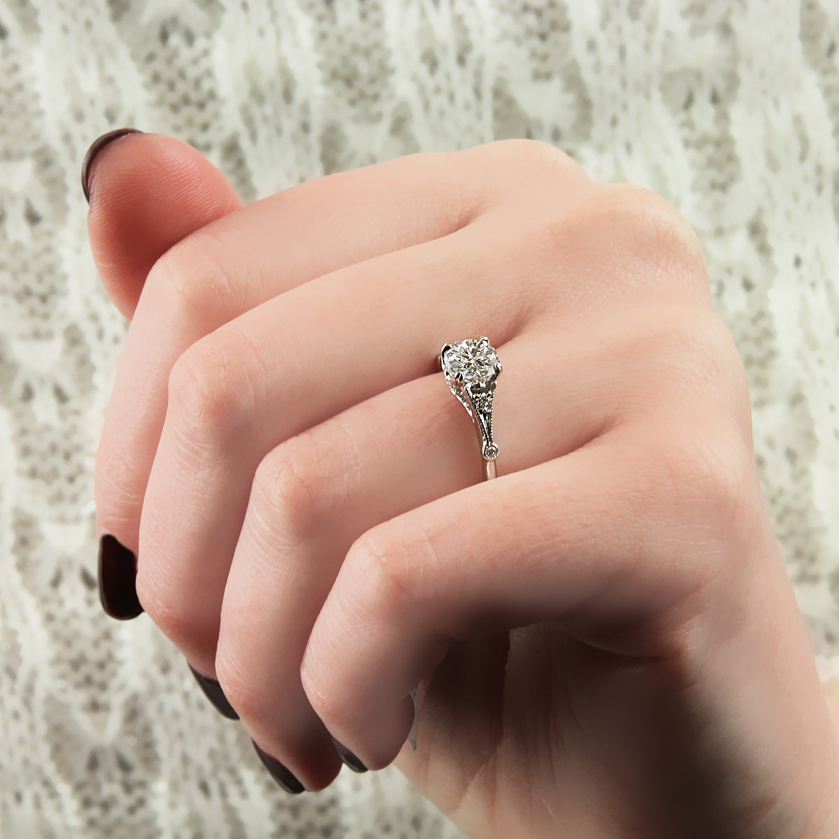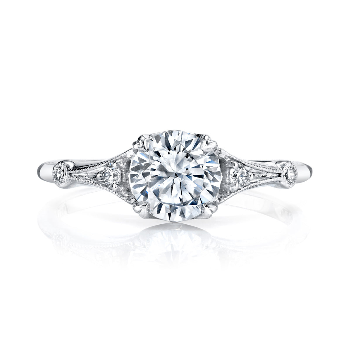 An Art Deco-inspired beauty exhibits a flush set brilliant center in four claw prongs and detailed with diamond set curved symmetrical sides and milgrain edges.