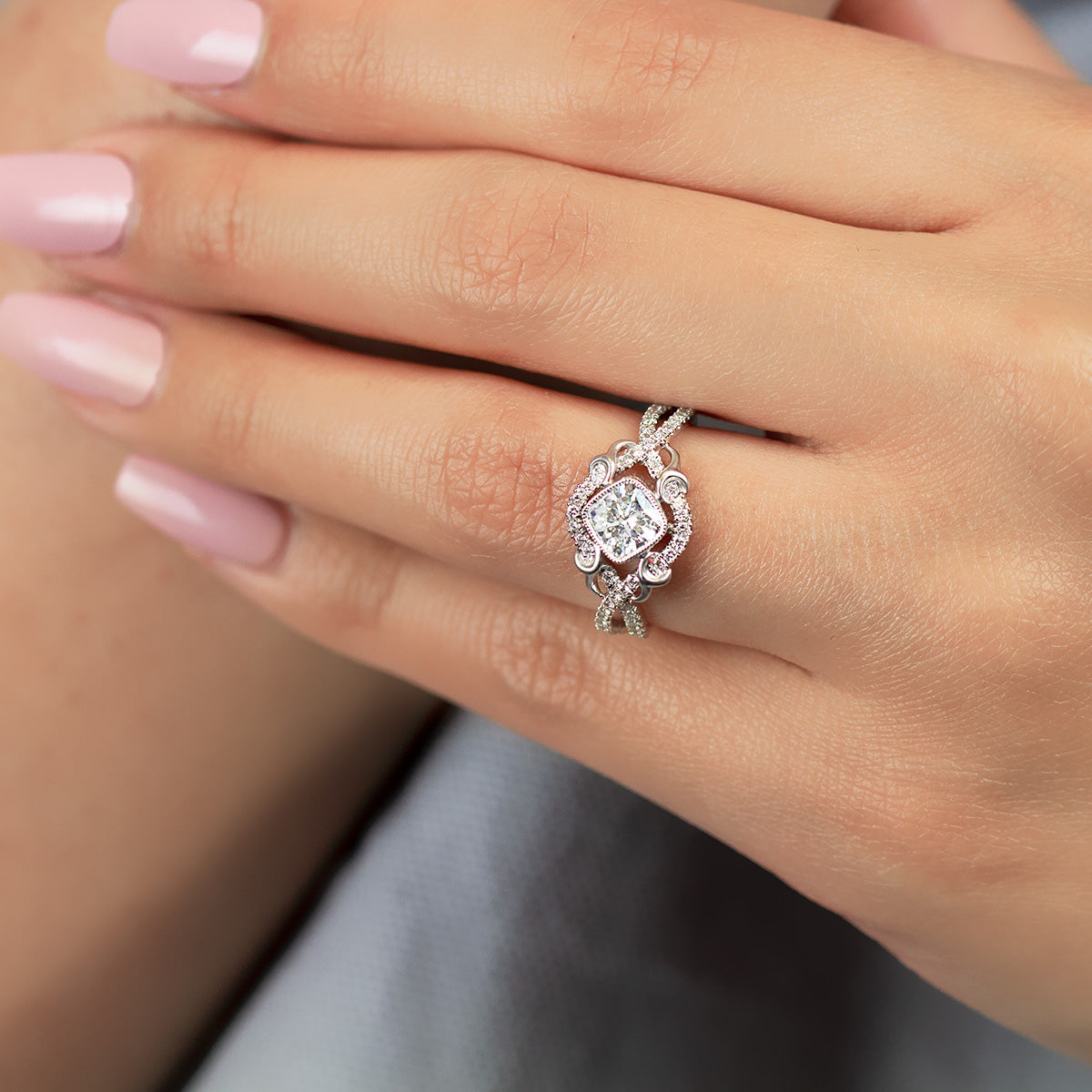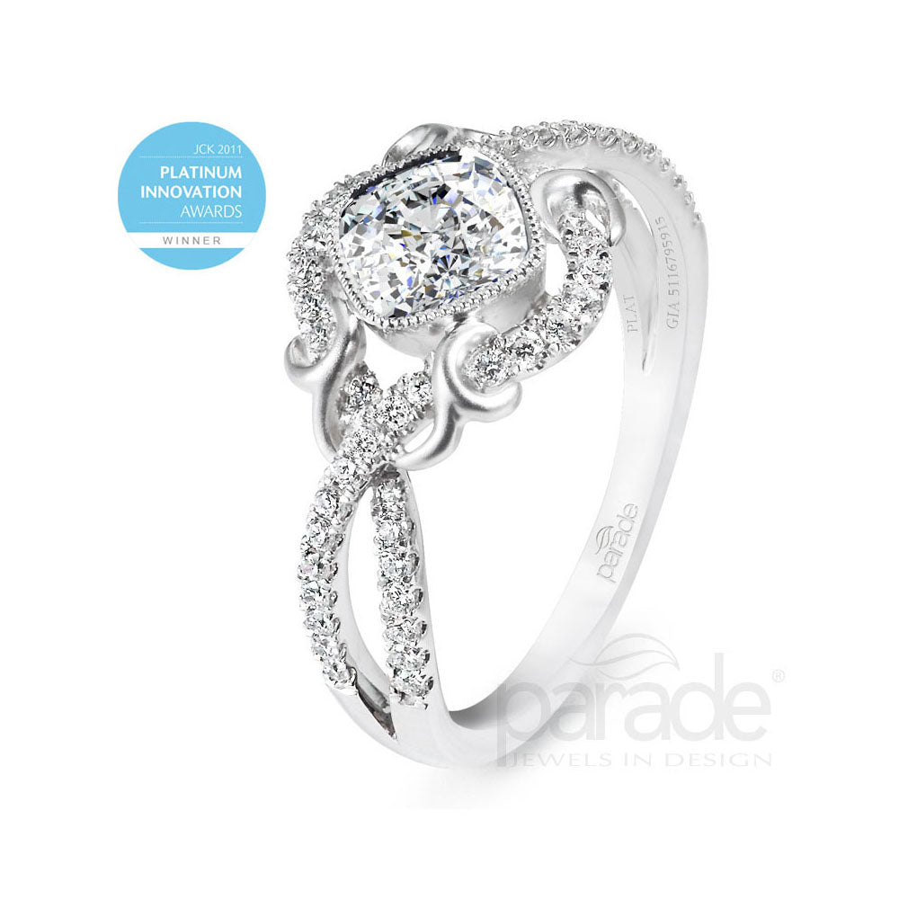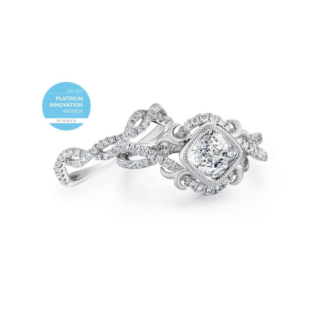 JCK Platinum Innovation Award Winner: Editor’s Choice 2011. The perfect pairing of sleek modernism with vintage romance: Satin brushed flourishes and gracefully intertwining rows of diamonds accentuate a cushion-cut diamond.