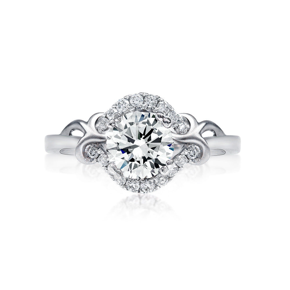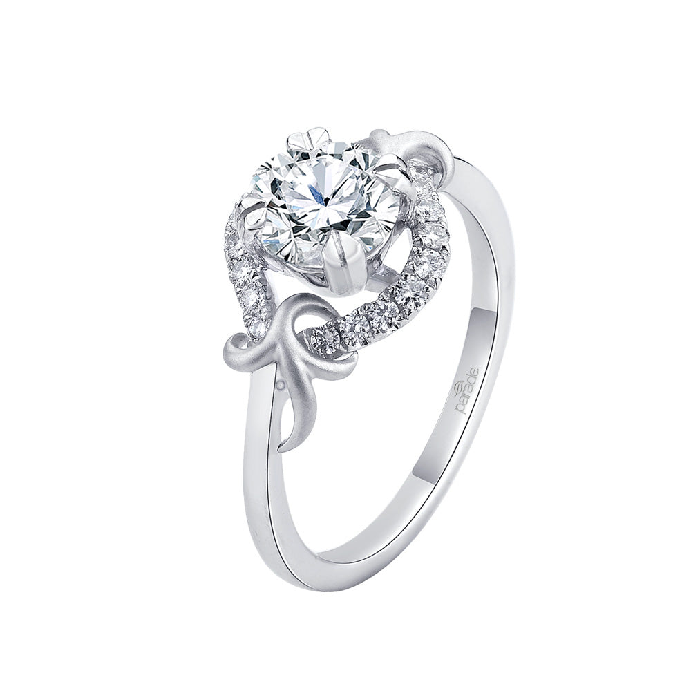 A more subdued version of Parade’s award-winning Lyria platinum design. Satin brushed flourishes of platinum and diamonds highlight a brilliant-cut diamond.