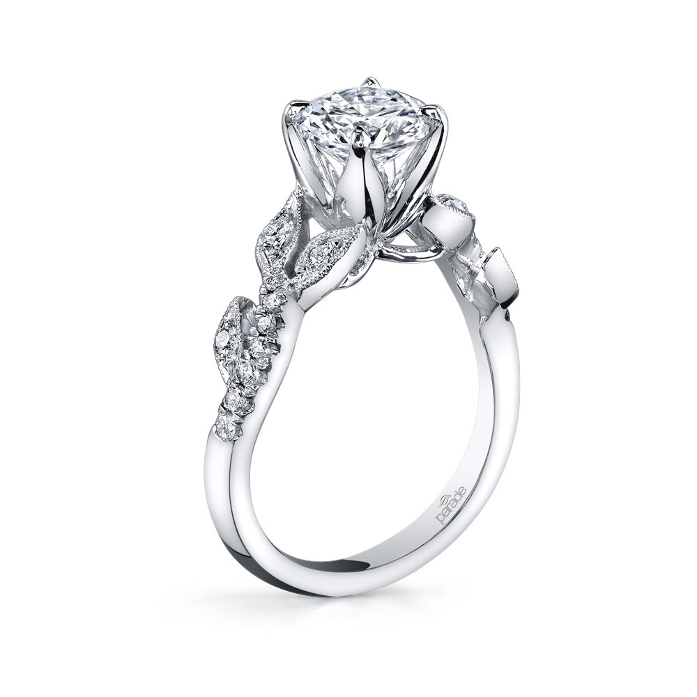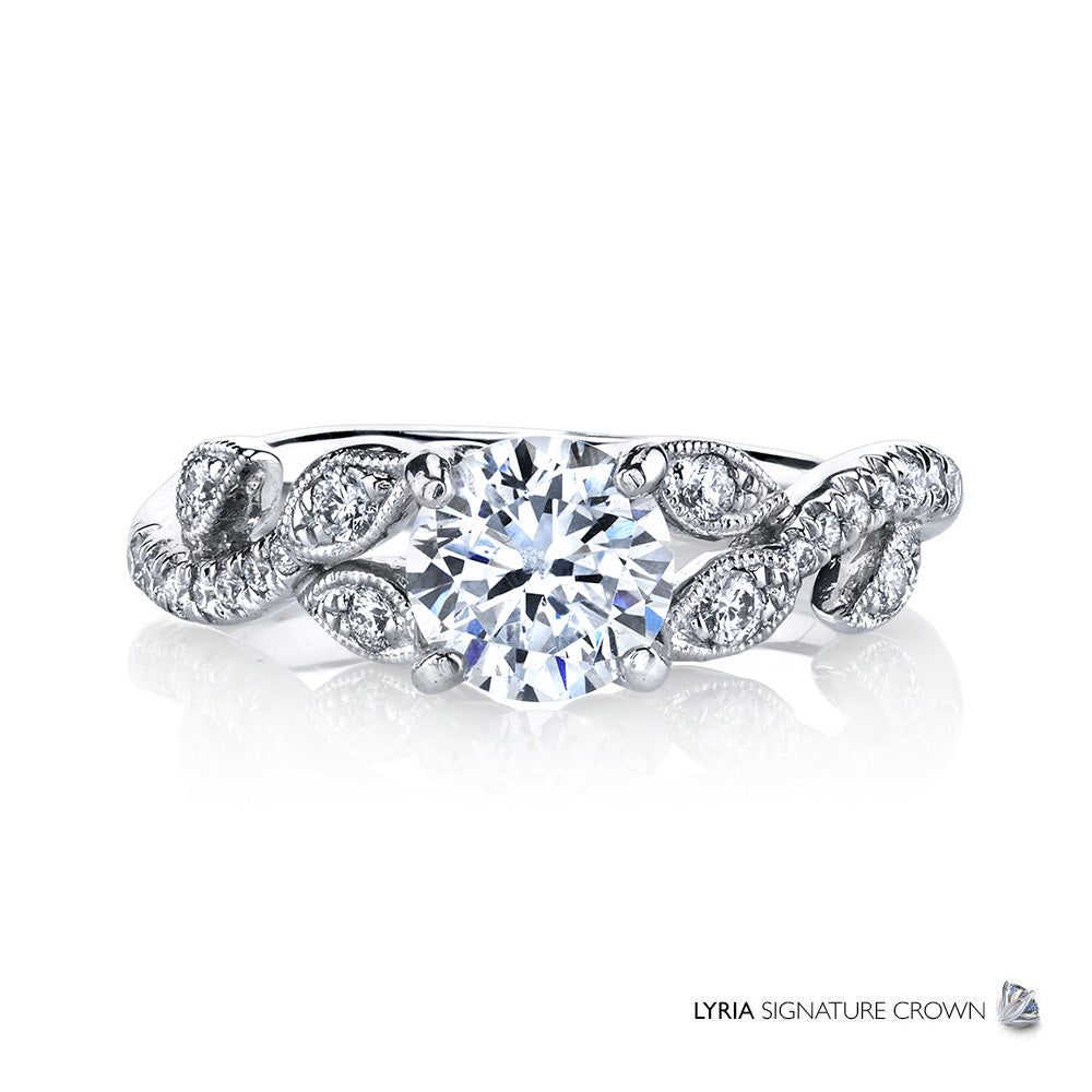 Milgrain-etched diamond accented leaves climb toward a brilliant center stone set in the signature Lyria crown.