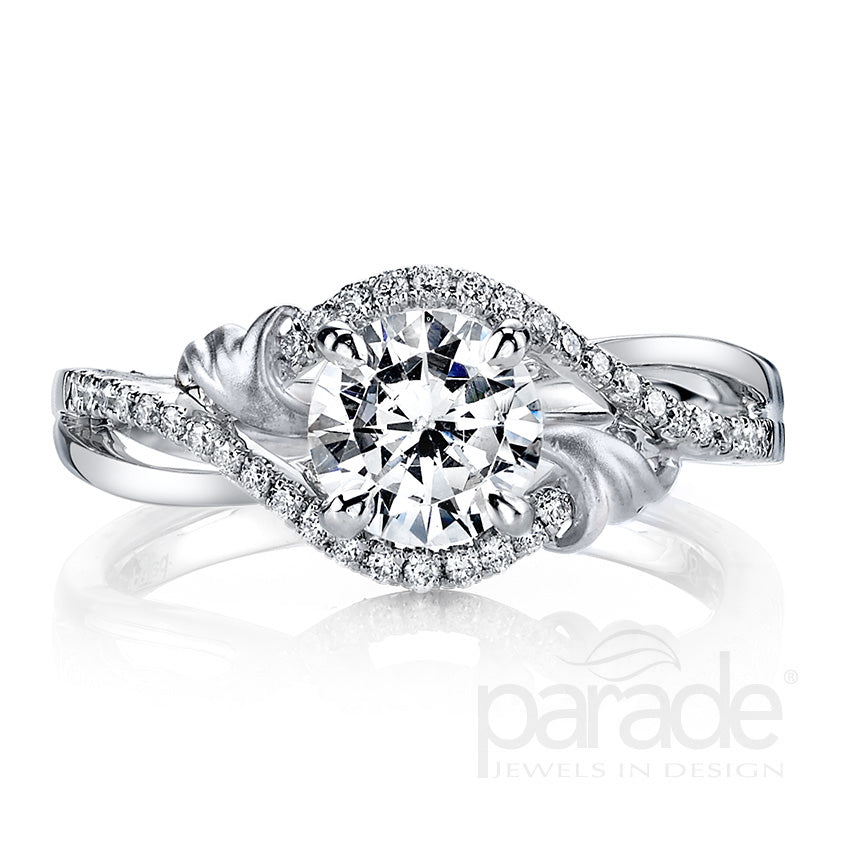 Delicate bands of white diamonds and brushed gold flourishes complement a sparkling center stone.