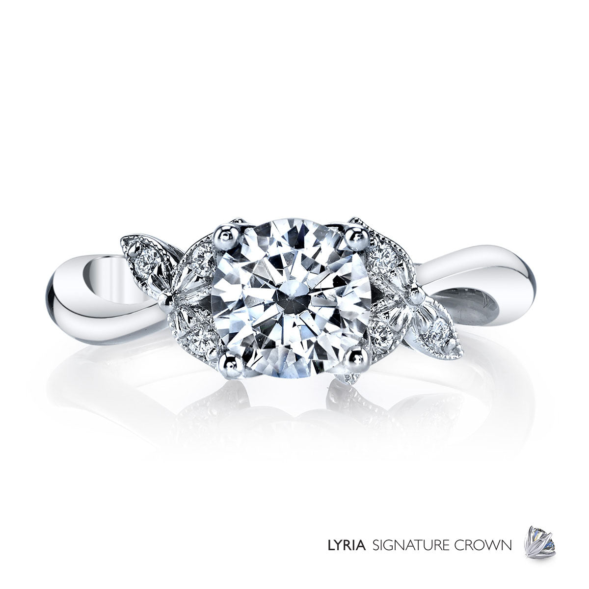 Gleaming vines of high polished gold climb towards diamond petals, presenting a sparkling center stone set in the LYRIA SIGNATURE CROWN.