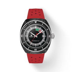 Discover the Tissot Sideral, a captivating fusion of vintage allure and modern craftsmanship. The watch features a 41mm wide forged carbon case and a bold red strap. The dial presents a multi-colored luminescent animation, amplifying its distinct appeal. Water-resistant up to 30 bar (300 meters) and equipped with Super-LumiNova® coated indices, the Sideral is a statement piece for trendsetters and history enthusiasts. Effortlessly modify your look with the interchangeable perforated rubber strap. Make a statement with the Tissot Sideral.