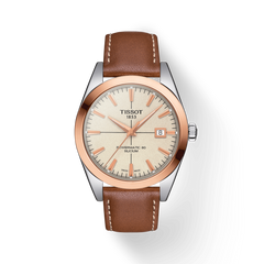 The Tissot Gentleman Auto is a two-colored watch with a 40 mm stainless steel diameter case embellished by an eye-catching bezel entirely made of 18 ct rose gold. The strong curved horns are an harmonious continuation of the watch favoring a pleasant wear around the wrist. It is endowed with a Powermatic 80 calibre with a silicon spring and “Waves of time” engraved on the rotor, the beauty of this watch shines from the inside and out, and will fit like a glove under any circumstances or type of clothing.