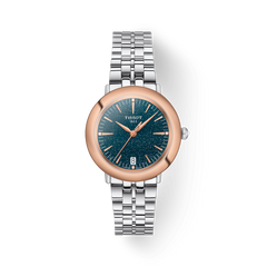 The Tissot Glendora T929.210.41.046.00 showcases a 33mm 316L stainless steel case with an 18K rose gold bezel, diamond accents on the dial, a precise Swiss Quartz movement, and a scratch-resistant sapphire crystal for lasting beauty and performance.