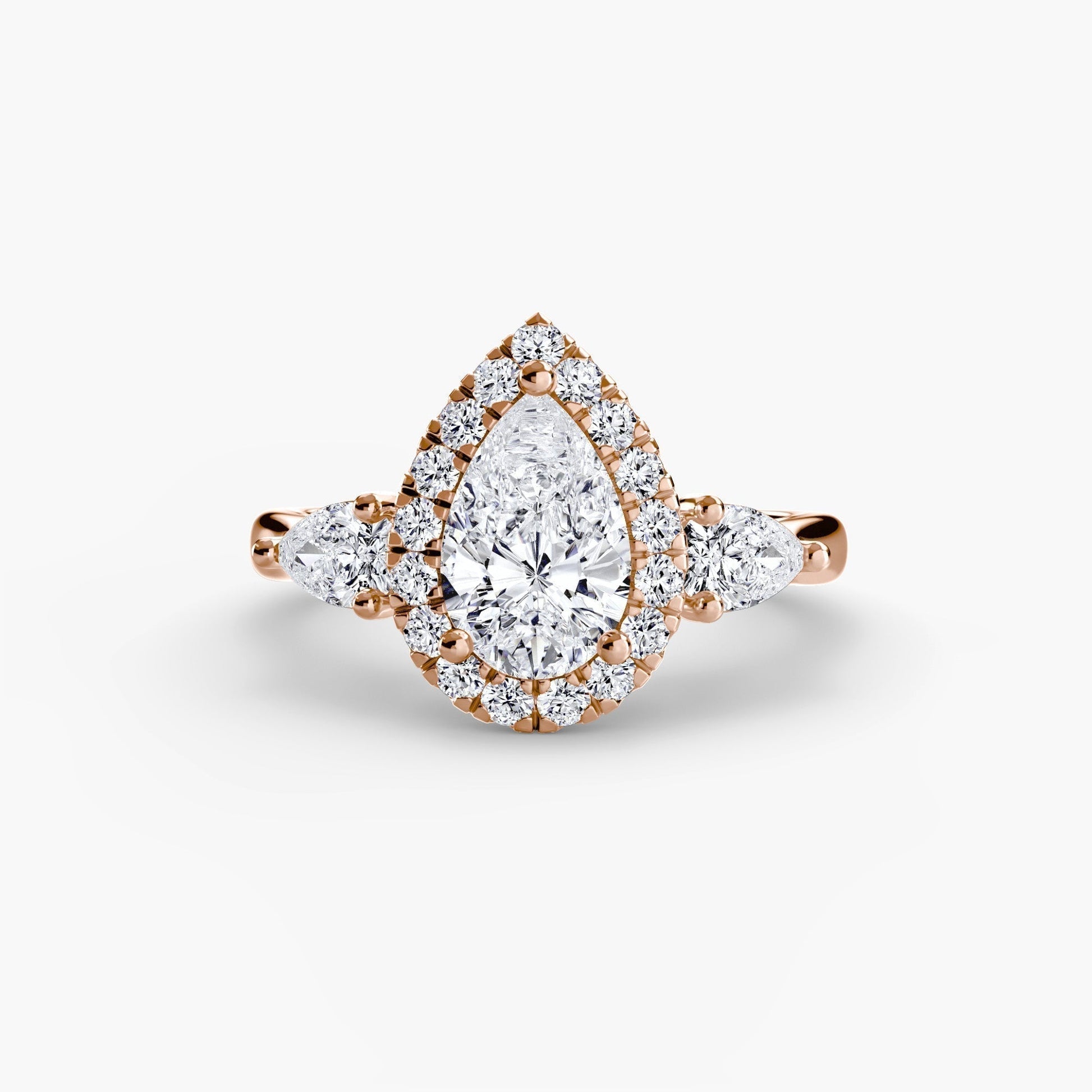 A unique take on the classic three-stone ring, this design is enhanced with a radiant halo for amplified brilliance and symbolism. Timeless with a modern twist.