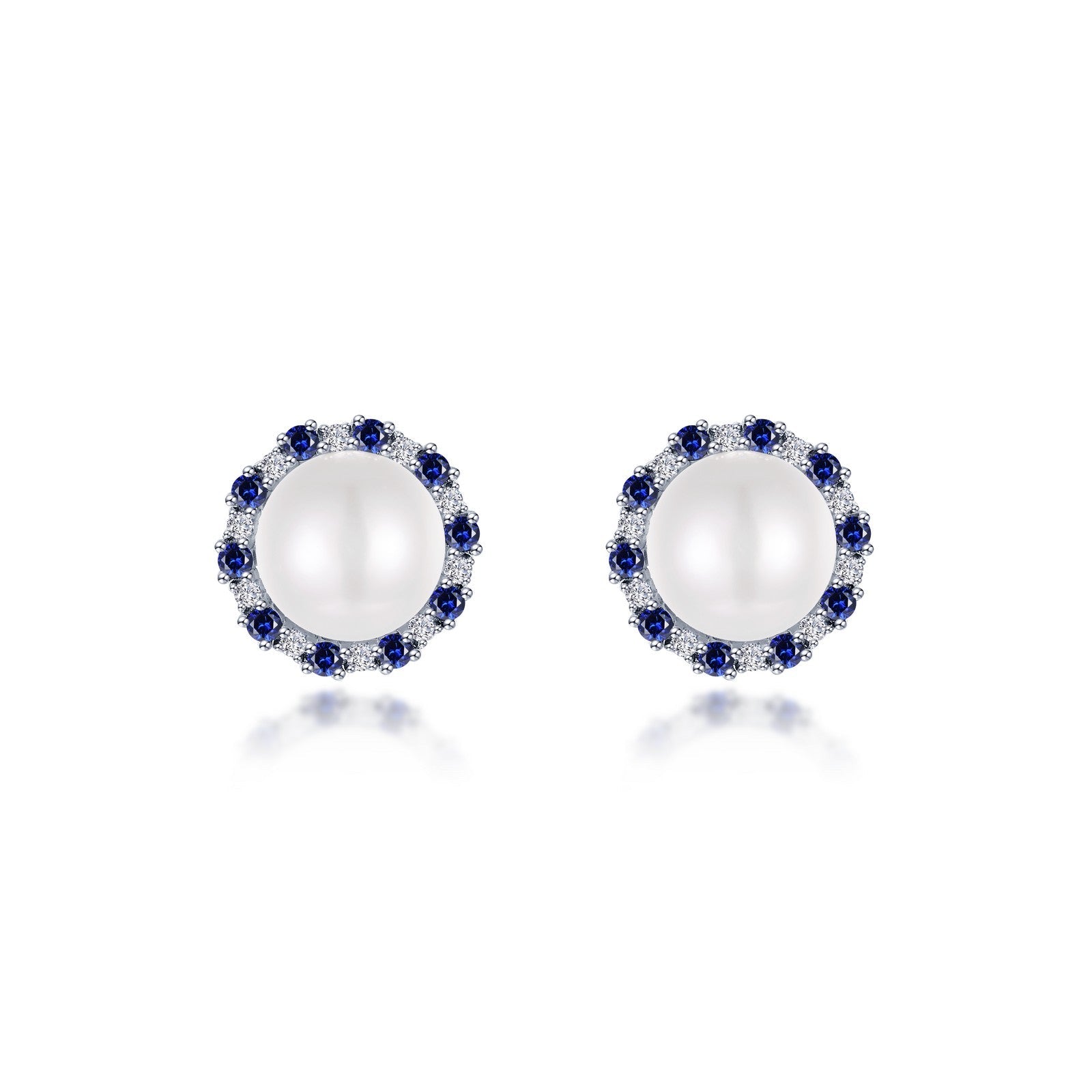 Elegant and sophisticated. These oversized cultured freshwater pearl halo stud earrings are set with Lafonn's signature Lassaire simulated diamonds and fancy lab-grown blue sapphires in sterling silver bonded with platinum. Lab-grown sapphires have the exact same chemical, mineral, and optical properties as natural sapphires which vary in color, texture and pattern. We make every effort to keep our lab-grown sapphire stone colors consistent. However, all lab-grown sapphires may not be exactly as shown on the website. Stones may appear lighter, darker or have natural variations.