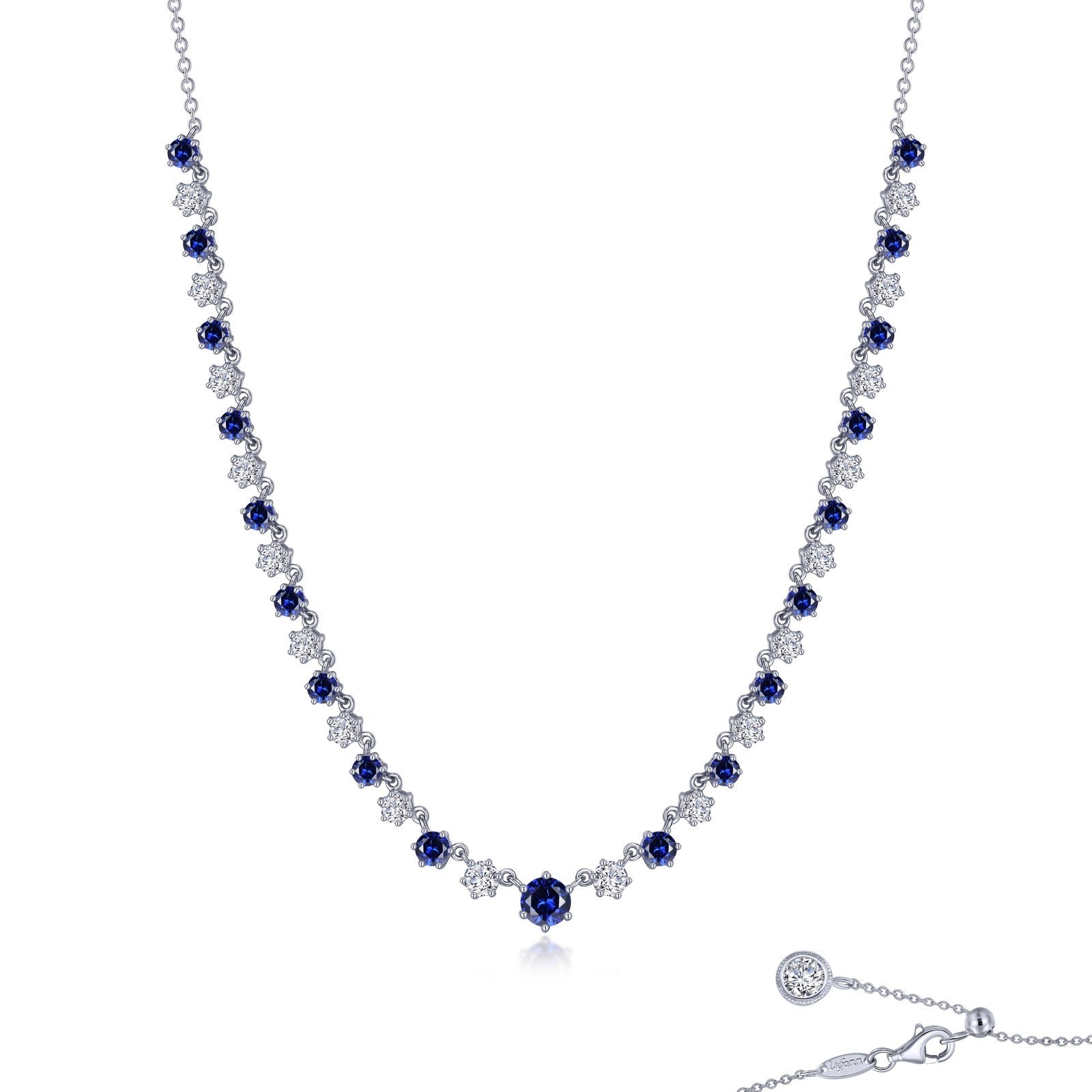 Elegant and sophisticated. This shimmering adjustable graduated alternating tennis choker necklace is set with Lafonn's signature Lassaire graduated simulated diamonds and fancy lab-grown sapphires in sterling silver bonded with platinum. Lab-grown sapphires have the exact same chemical, mineral, and optical properties as natural sapphires which vary in color, texture and pattern. We make every effort to keep our lab-grown sapphire stone colors consistent. However, all lab-grown sapphires may not be exactly as shown on the website. Stones may appear lighter, darker or have natural variations.