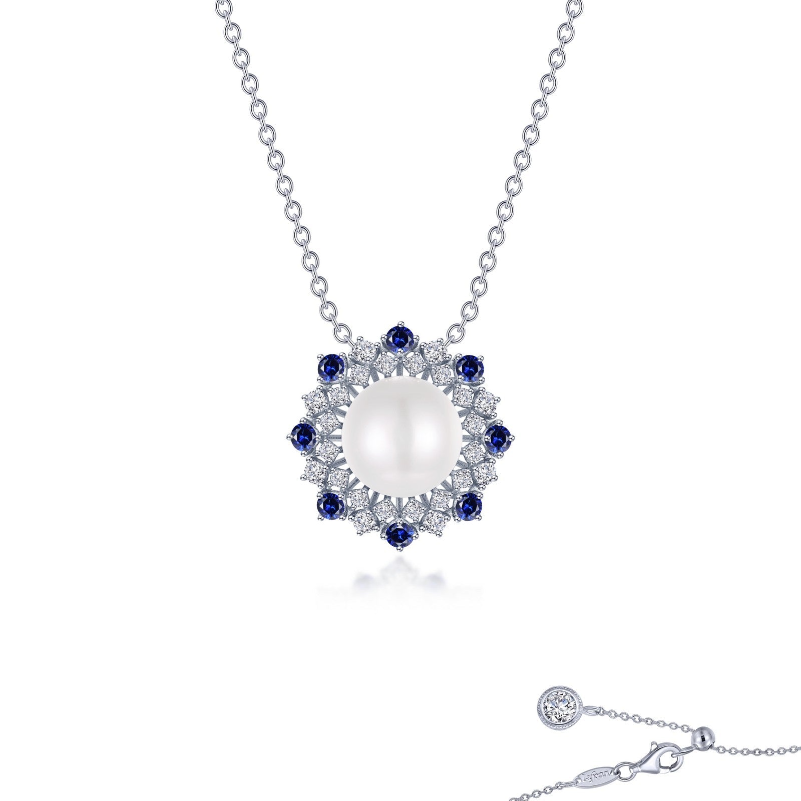 Elegant and sophisticated. This adjustable oversized cultured freshwater pearl sunburst necklace is set with Lafonn's signature Lassaire simulated diamonds and fancy lab-grown blue sapphires in sterling silver bonded with platinum. Lab-grown sapphires have the exact same chemical, mineral, and optical properties as natural sapphires which vary in color, texture and pattern. We make every effort to keep our lab-grown sapphire stone colors consistent. However, all lab-grown sapphires may not be exactly as shown on the website. Stones may appear lighter, darker or have natural variations.