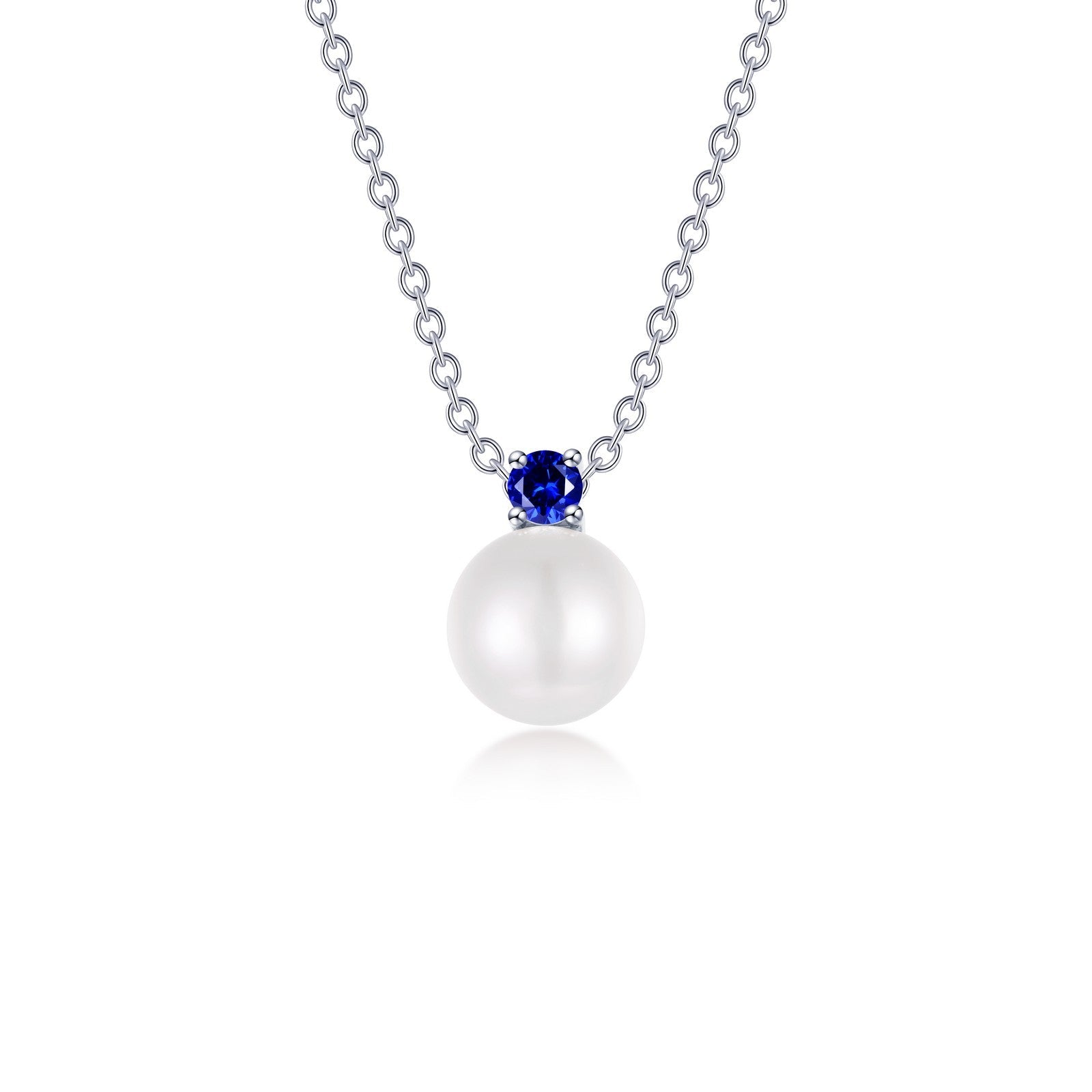 Simple yet classic. This cultured freshwater pearl solitaire necklace is set with a fancy lab-grown blue sapphire in sterling silver bonded with platinum. Lab-grown sapphires have the exact same chemical, mineral, and optical properties as natural sapphires which vary in color, texture and pattern. We make every effort to keep our lab-grown sapphire stone colors consistent. However, all lab-grown sapphires may not be exactly as shown on the website. Stones may appear lighter, darker or have natural variations.