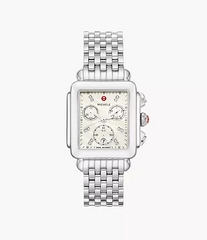 Inspired by the geometric shapes of Art Deco architecture, this iconic stainless timepiece features a Swiss chronograph movement with 12 brilliant hand-set diamonds (0.05 carat weight) along the mother-of-pearl dial with double diamond hour markings and our signature MICHELE crown. A stainless steel seven-link bracelet adds the finishing touch and is interchangeable with any 18mm MICHELE strap.