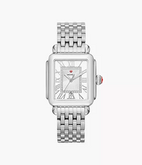 This two-tone Deco Madison offers a sleek take on the classic Deco with gold-plated Roman numeral indexes and 47 diamonds on the silver sunray dial. The two-tone bracelet is interchangeable with any 18mm MICHELE strap.