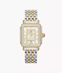 This two-tone Deco Madison offers a sleek take on the classic Deco with gold-plated Roman numeral indexes on the silver sunray dial and 155 diamonds covering the bezel and dial. The two-tone stainless and 18K gold bracelet is interchangeable with any 18mm MICHELE strap.