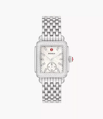 Inspired by the geometric shapes of Art Deco architecture, this stainless Deco Mid shines with 126 hand-set diamonds (0.57 carat weight) on the bezel and white mother-of-pearl dial adorned with double diamond hour markings. The signature MICHELE crown accents this stunning timepiece with a Swiss movement and the iconic seven-link stainless steel bracelet is interchangeable with any 16mm MICHELE strap.