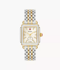 DECO MID TWO TONE DIAMOND BEZEL MOTHER OF PEARL DIAMOND DIAL TWO TONE BRACELET Silver-tone stainless steel case with a two-tone (silver-tone and yellow gold-tone) stainless steel bracelet. Fixed yellow gold-tone bezel with diamond set stainless steel. Mother of pearl dial with yellow gold-tone hands and diamond hour markers. Minute markers around the outer rim. Dial Type: Analog. Luminescent hands and markers. Quartz movement. Scratch resistant sapphire crystal. Rectangle case shape, case size: 29 mm. Fold over clasp with a safety release. Functions: hour, minute, second. Deco Mid Series. Casual watch style. Watch label: Swiss Made. Michele Deco Mid Quartz Diamond Ladies Watch MWW06V000123.