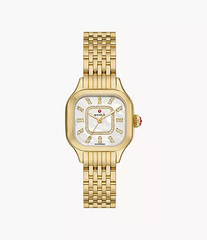 Elegant curves add modern elegance to the case of MICHELE's stunning Meggie watch that sparkles with 60 hand-set diamonds (0.19 carat weight) on the mother-of-pearl dial with diamond inner ring and double diamond indexes. This watch features a Swiss movement and a gleaming 14mm seven-link 18K gold-plated seven-link bracelet made specifically for the Meggie collection interchangeable with any 14mm MICHELE strap.