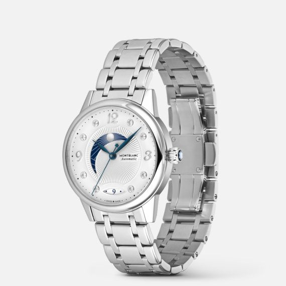 Bohème is Montblanc’s key feminine product line that interprets the codes of fine watchmaking. The product line blends simplicity with timeless design and features refined complications for today’s independent women. The Montblanc Bohème Day & Night comes in a 34 mm stainless steel case with a silver-white colored guilloché dial. The day/night indicator allows the wearer to know whether it is day or night just by glancing at the dial. The day is indicated by a light blue sky and gold-colored sun, while the night is represented by a silver-colored moon in a dark blue sky. This refined model features rhodium-coated numerals, diamond indexes and blued steel hands. A stainless steel bracelet completes the overall design. The Montblanc Bohème Day & Night complication is as romantic as it is practical as it can be easily adjusted via the crown without accidentally changing the date.