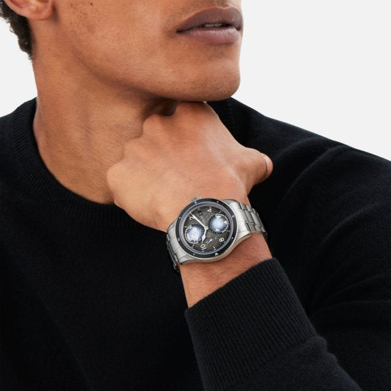 Paying tribute to the world’s highest peaks and the alpinists who dare to climb them enduring extreme conditions, this Montblanc 1858 Geosphere 0 Oxygen The 8000 is housed in a 42mm titanium case totally devoid of oxygen. This has several advantages for explorers by eliminating fogging and preventing oxidization, thus allowing the movement to last far longer with greater precision. The timepiece is powered by the MB 29.25 automatic movement with Manufacture Worldtime complication which includes the time of the 24-hour zones readable on the luminescent continents of the 3D turning Northern and Southern Hemisphere globes, day & night indications, dual time display, and a date. The timepiece also comes with a fluted bi-directional black ceramic bezel with luminescent cardinal points, a Sfumato dark gray glacier pattern dial with orange accents, and an interchangeable titanium bracelet with a taper and fine adjustment system. The case back for this model features a 3D laser engraving of the K2 mountain that is depicted with incredible color, depth, and realism.