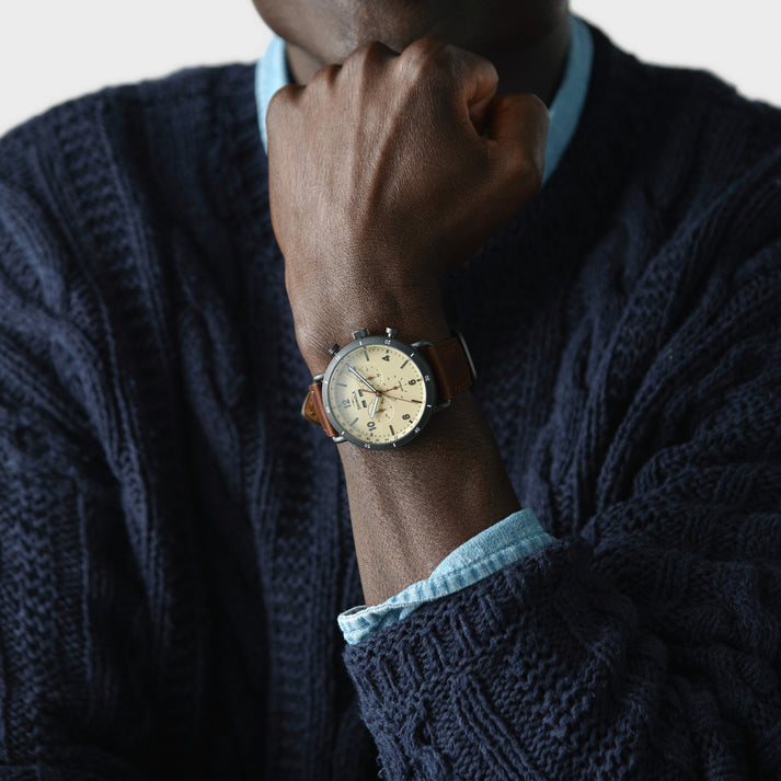 An elevated timepiece for your everyday, this 45mm Canfield Sport is designed to strike up a conversation. This chronograph features a stainless-steel case with a sandblast gunmetal finish, black ceramic bezel and light gray dial punctuated with three sub dials and a dual calendar aperture. This watch is instinctively sporty and—with its captivating and versatile colorway—a wardrobe staple.