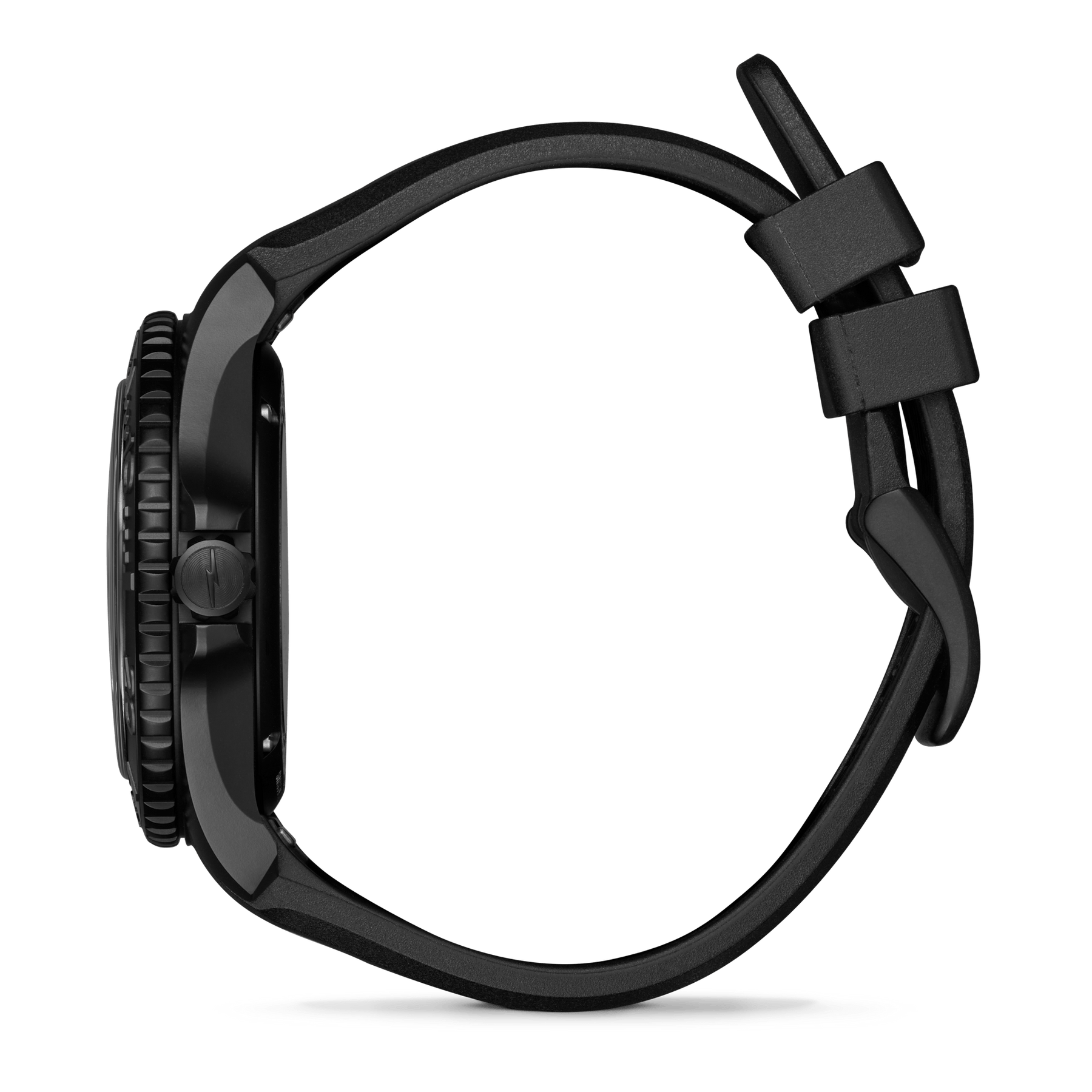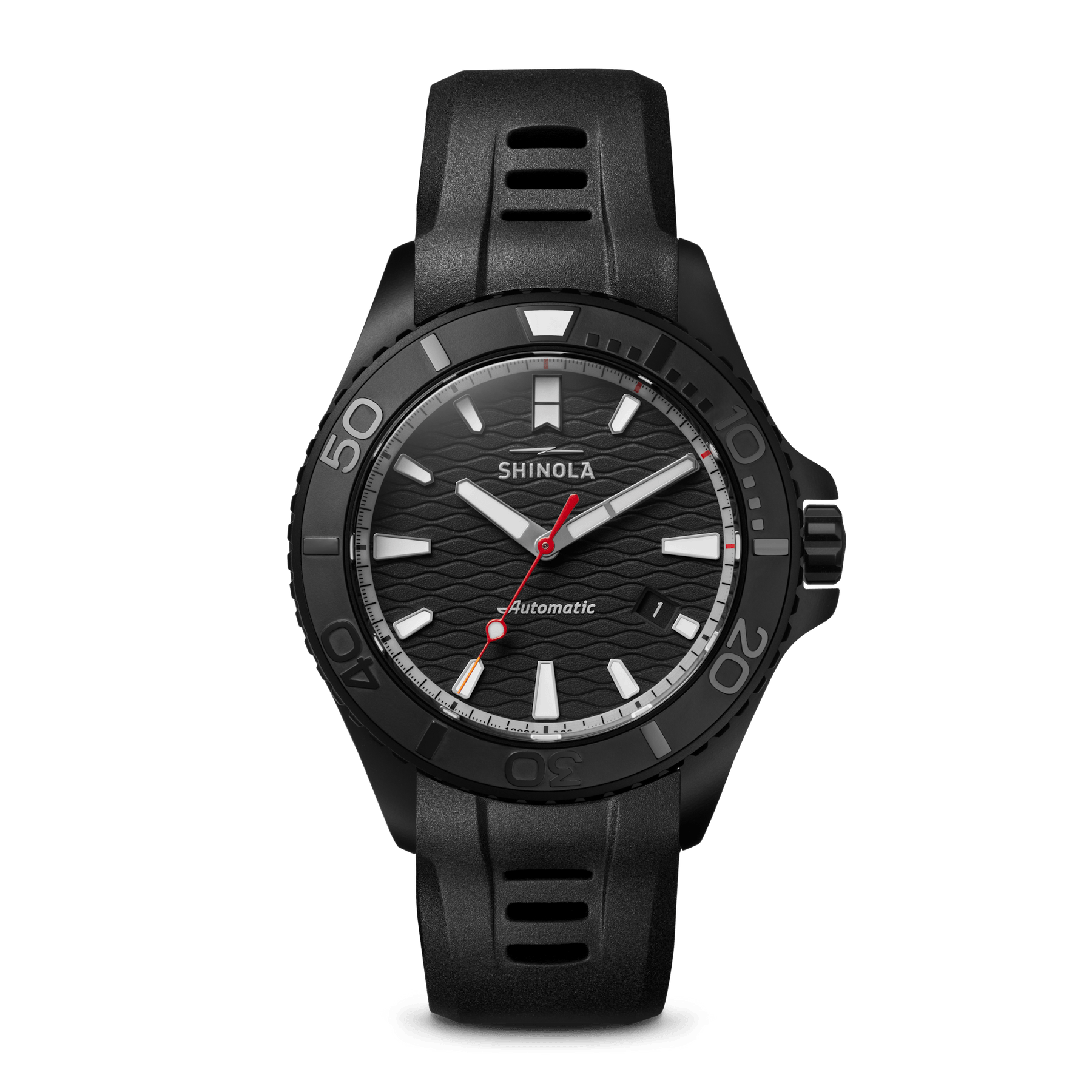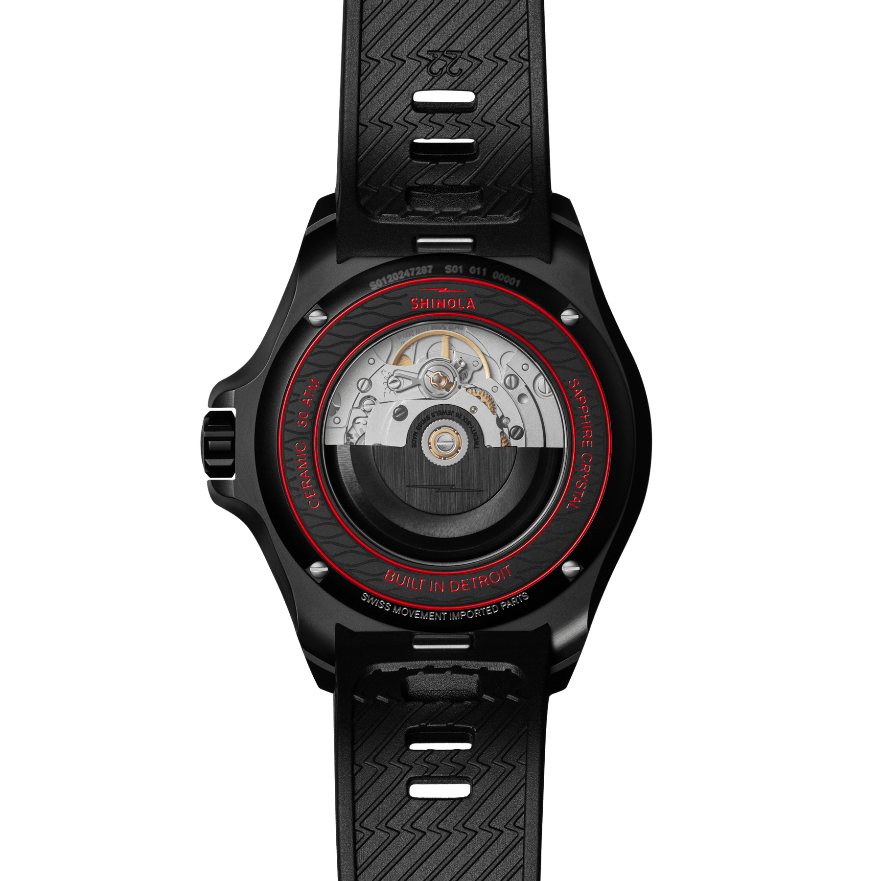 The Shinola Monster series continues to push the boundaries with cutting-edge materials—and the Ceramic Monster Automatic is no different. This stunning sport watch features a case body and unidirectional bezel insert crafted with scratch-resistant, lightweight black ceramic. High-grade 316L black PVD-coated stainless steel gives the core and crown its trademark strength and durability and houses the powerful automatic movement, revealed by an exhibition window.  An integrated black rubber strap is an extension of the ceramic watch case. Beautiful details harken to legendary tales of life on the water—core to the Shinola Monster family. Admire the wave-etched dial and caseback and pops of color inspired by the heroic fireboats of the Great Lakes.