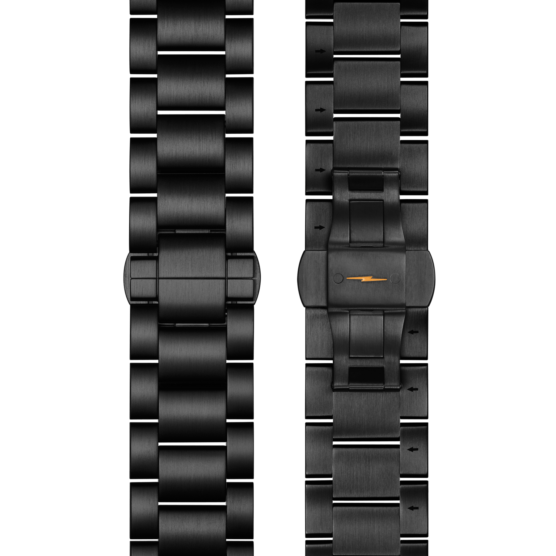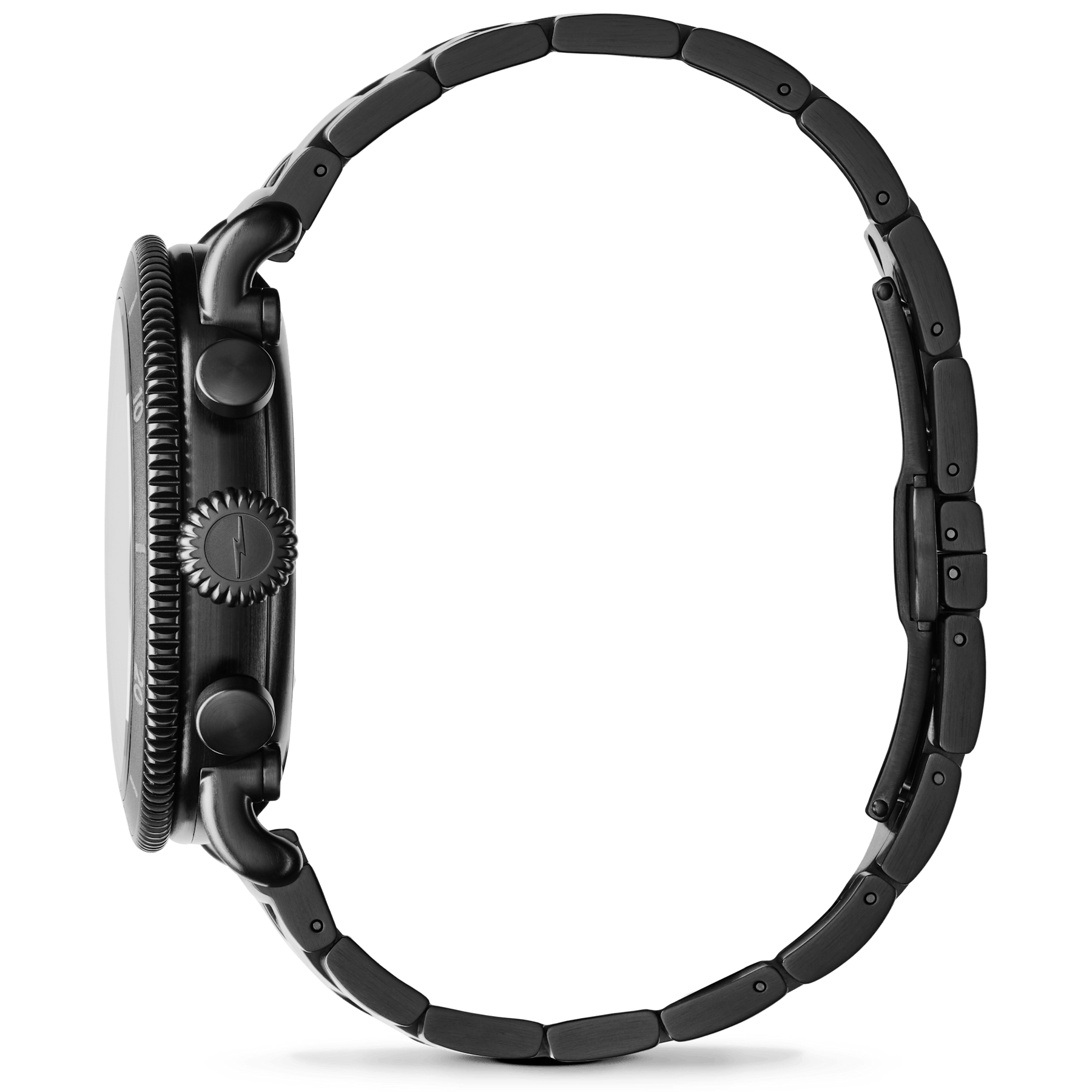 Stealth mode, Runwell style. This 48mm Runwell Sport Chronograph is crafted from stainless steel with a sandblasted PVD black finish. The gunmetal black dial features a sandblasted sunray finish and is accentuated by shiny gray outlined numbers that are finished with multiple layers of black lum. A black ceramic top ring insert with PVD plated numbers finishes the look. From the stainless steel case and bracelet to the double-domed sapphire crystal, this blacked-out chronograph built to last with exacting precision and style to spare.