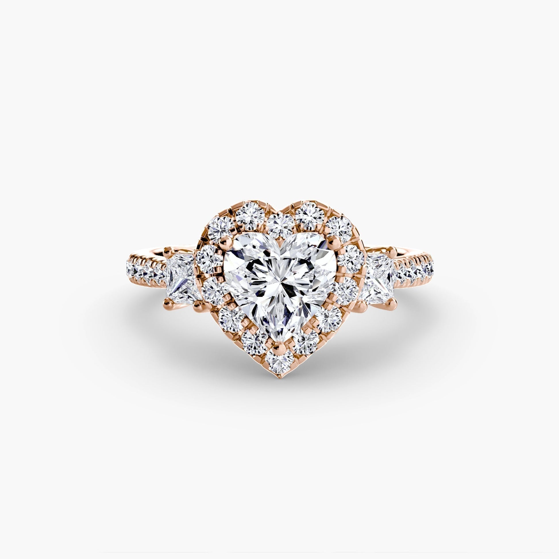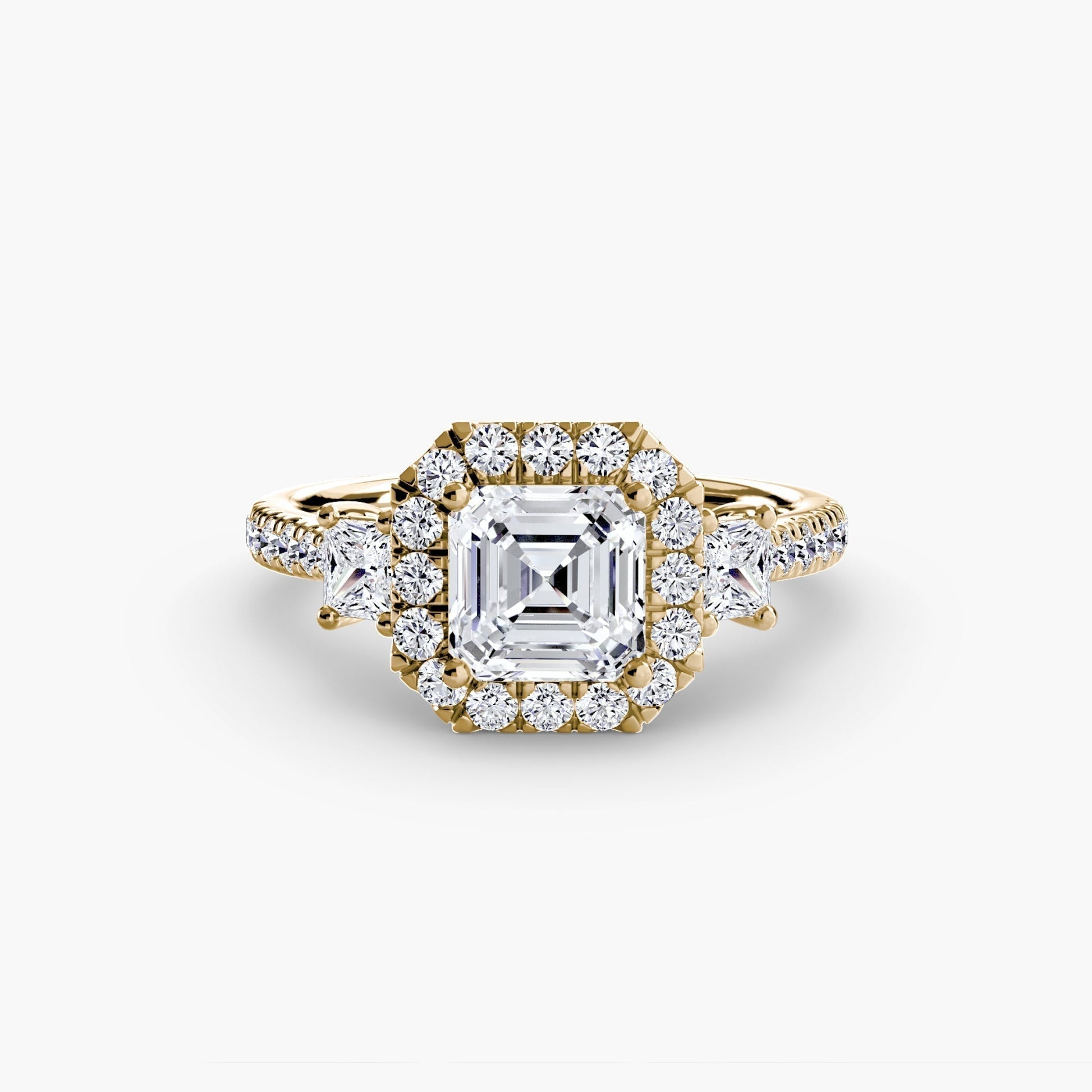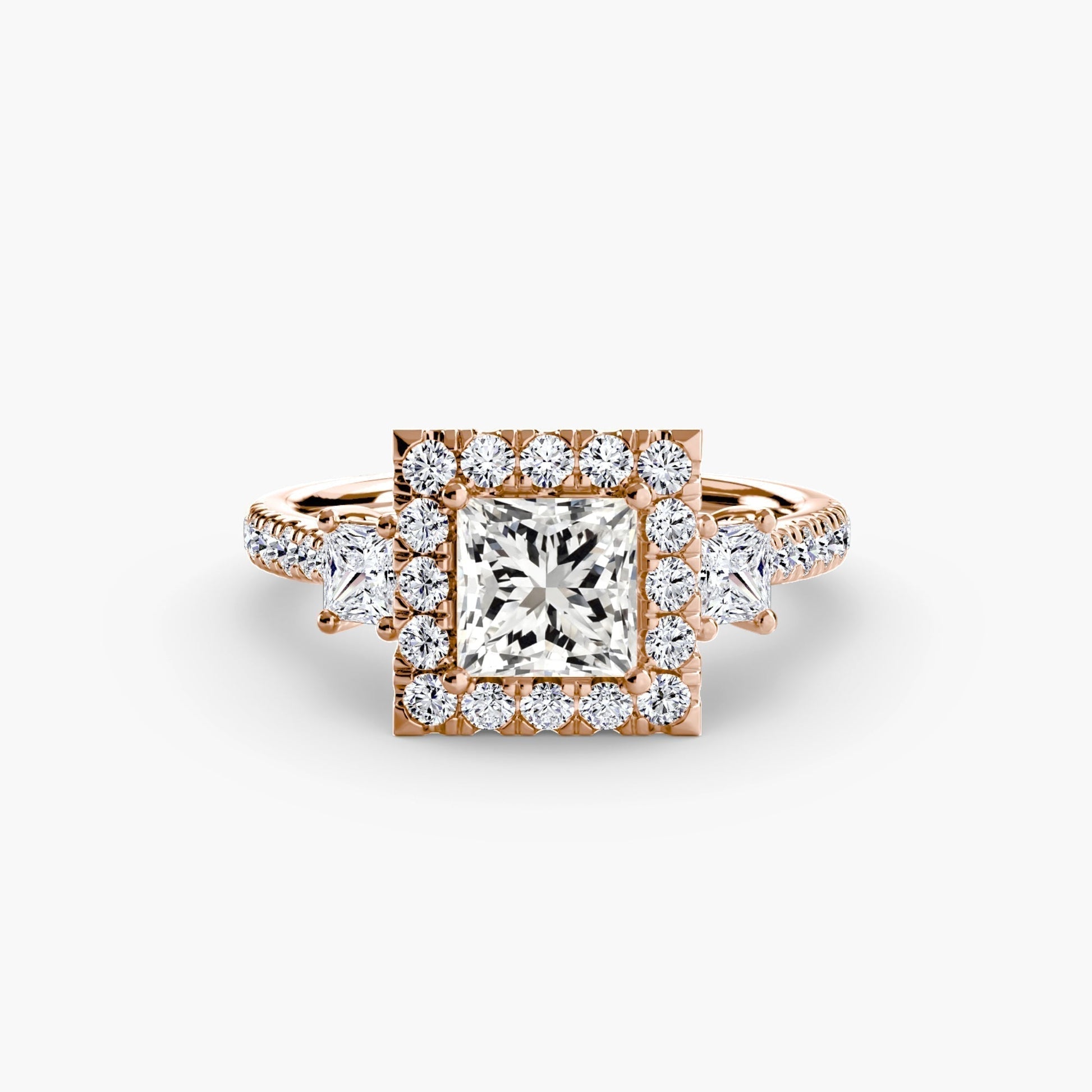 A unique take on the classic three-stone ring, this design is enhanced with a radiant halo for amplified brilliance and symbolism. Timeless with a modern twist.