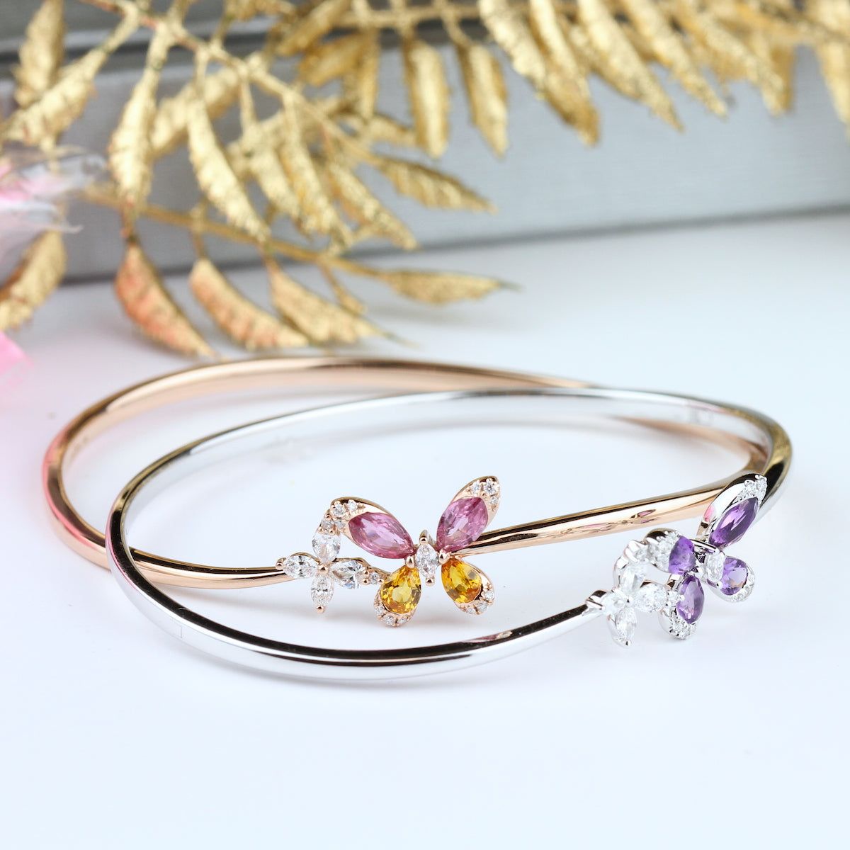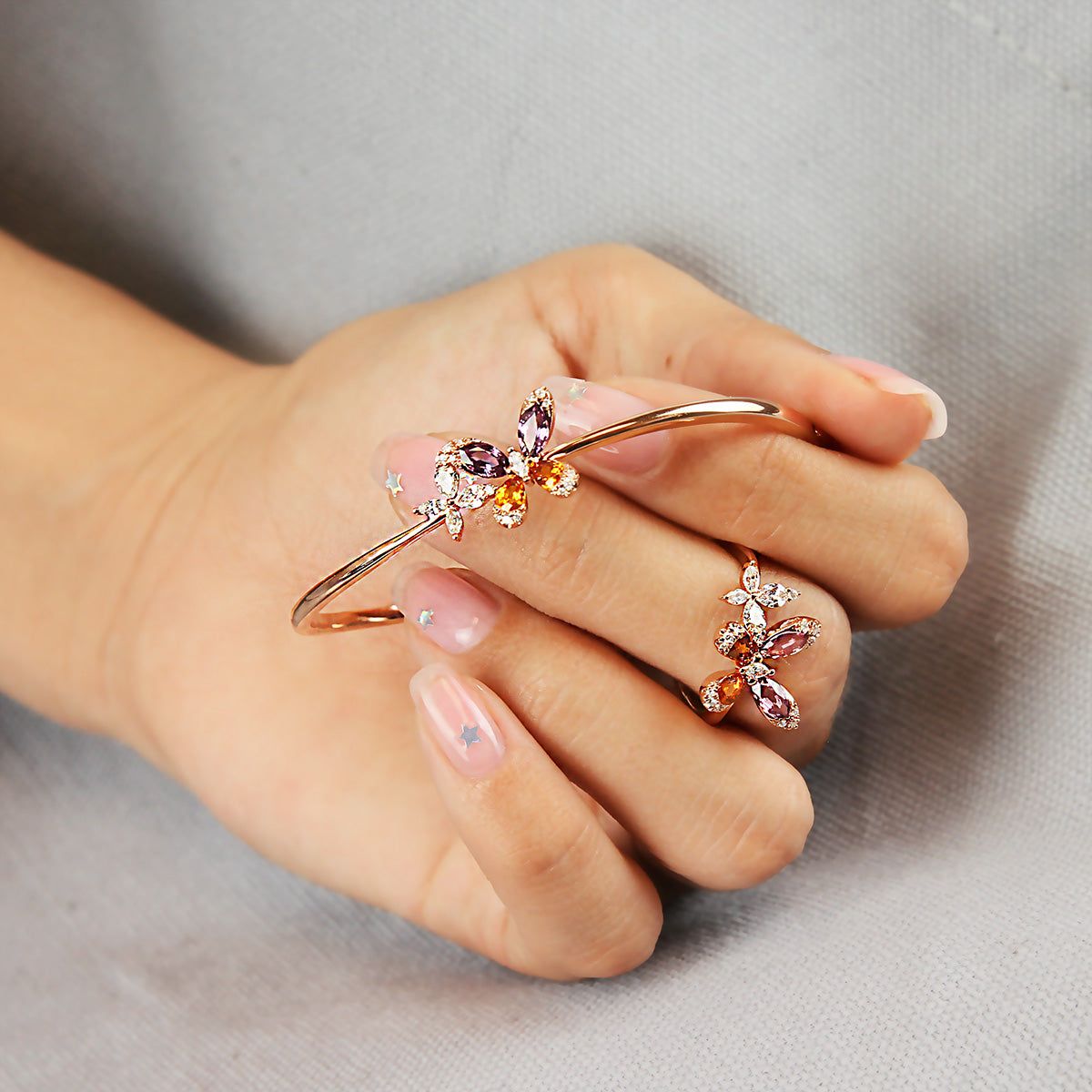 Sparkling pink sapphire and white diamond blossom ring with a carefully matched ombre band in 18K white gold.