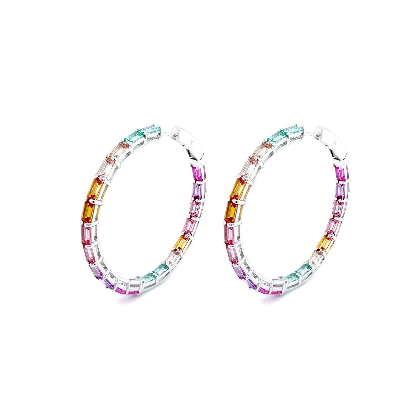 Elegant and sophisticated. These dazzling inside out hoop earrings feature sparkling multi-colored fancy lab-grown sapphires in sterling silver bonded with platinum. 45mm diameter. Lab-grown sapphires have the exact same chemical, mineral, and optical properties as natural sapphires which vary in color, texture and pattern. We make every effort to keep our lab-grown sapphire stone colors consistent. However, all lab-grown sapphires may not be exactly as shown on the website. Stones may appear lighter, darker or have natural variations.