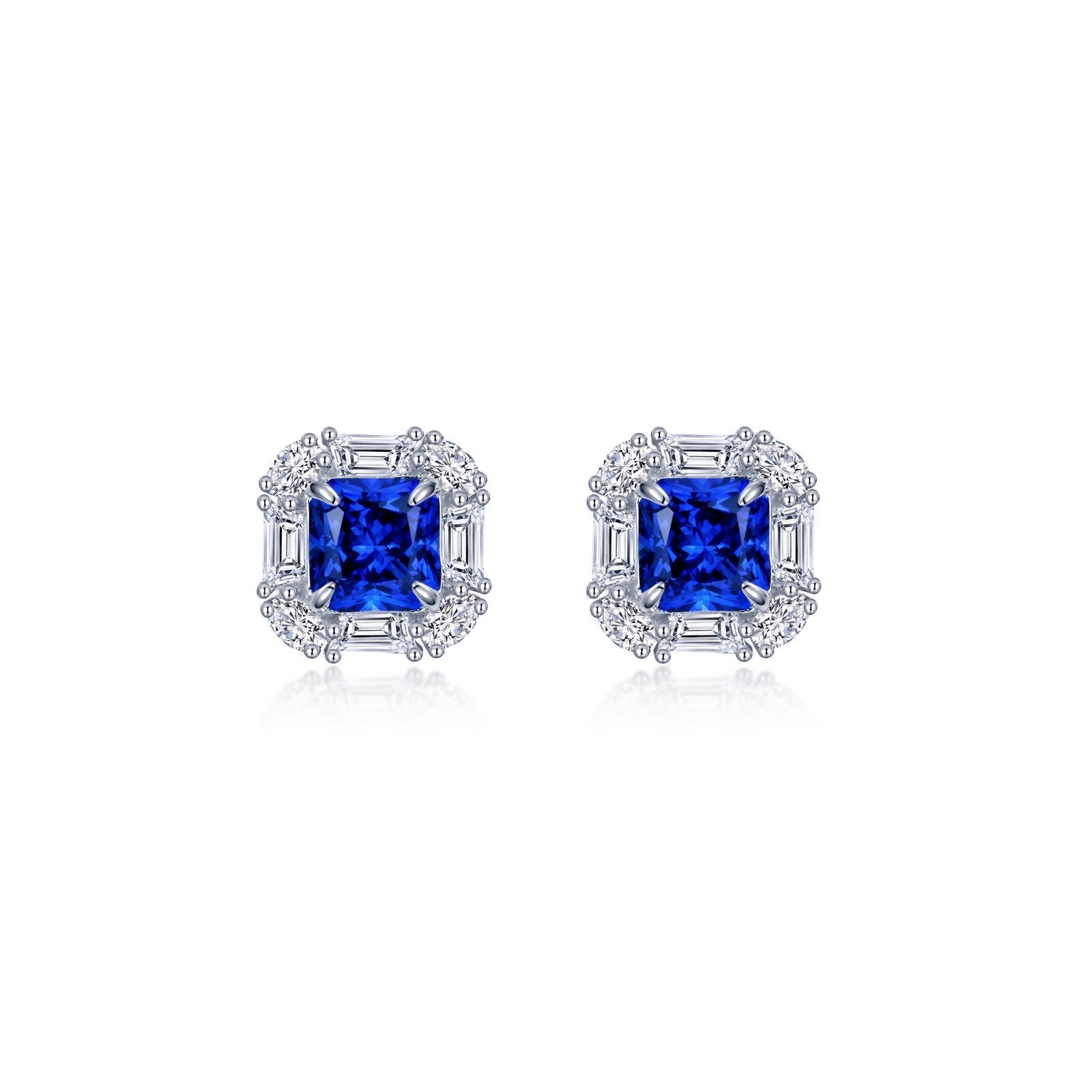 Timeless elegance for everyday wear. Each of these stunning halo earrings features a princess-cut blue lab-grown sapphire surrounded by Lafonn's signature Lassaire oval and baguette simulated diamonds. These earrings are set in sterling silver bonded with platinum. Lab-grown sapphires have the exact same chemical, mineral, and optical properties as natural sapphires which vary in color, texture and pattern. We make every effort to keep our lab-grown sapphire stone colors consistent. However, all lab-grown sapphires may not be exactly as shown on the website. Stones may appear lighter, darker or have natural variations.