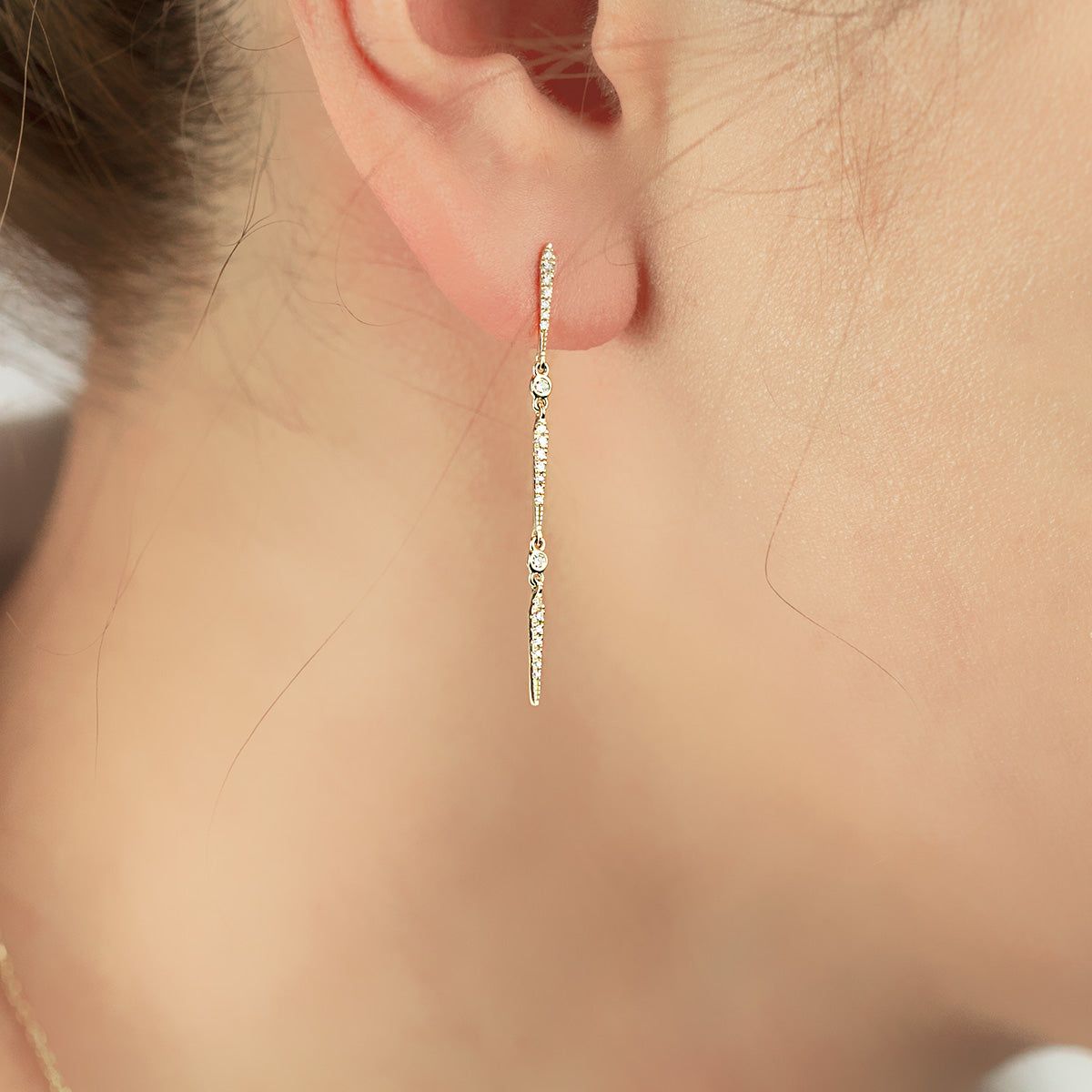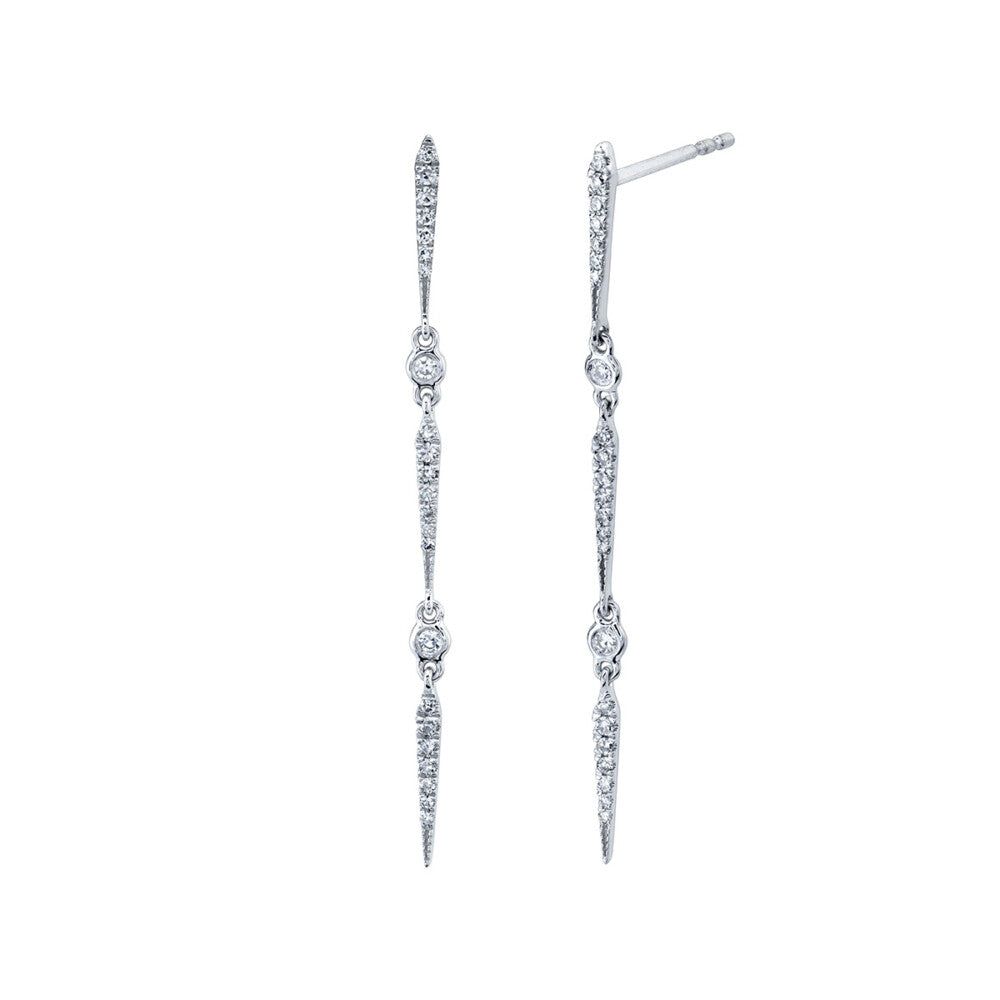 This dangling elegance features a triple line of single-cut round diamonds-encrusted pinched bars with alternating diamond bezels.