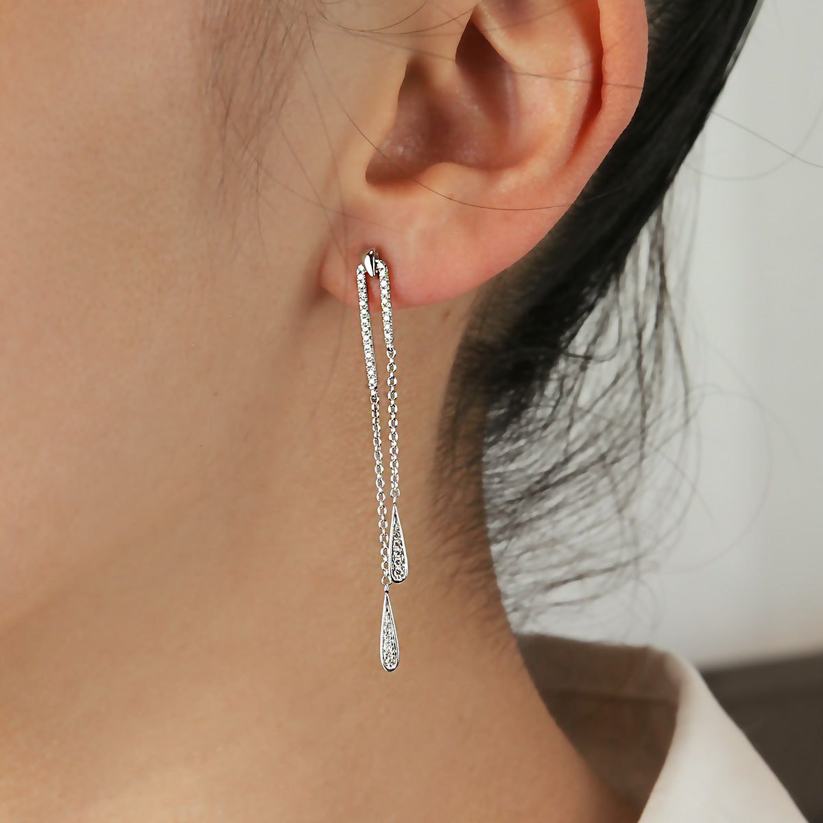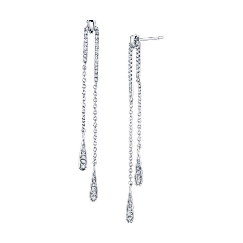 Two strand diamond drop earrings crafted in 18K white gold featuring diamonds set in a pear shape.