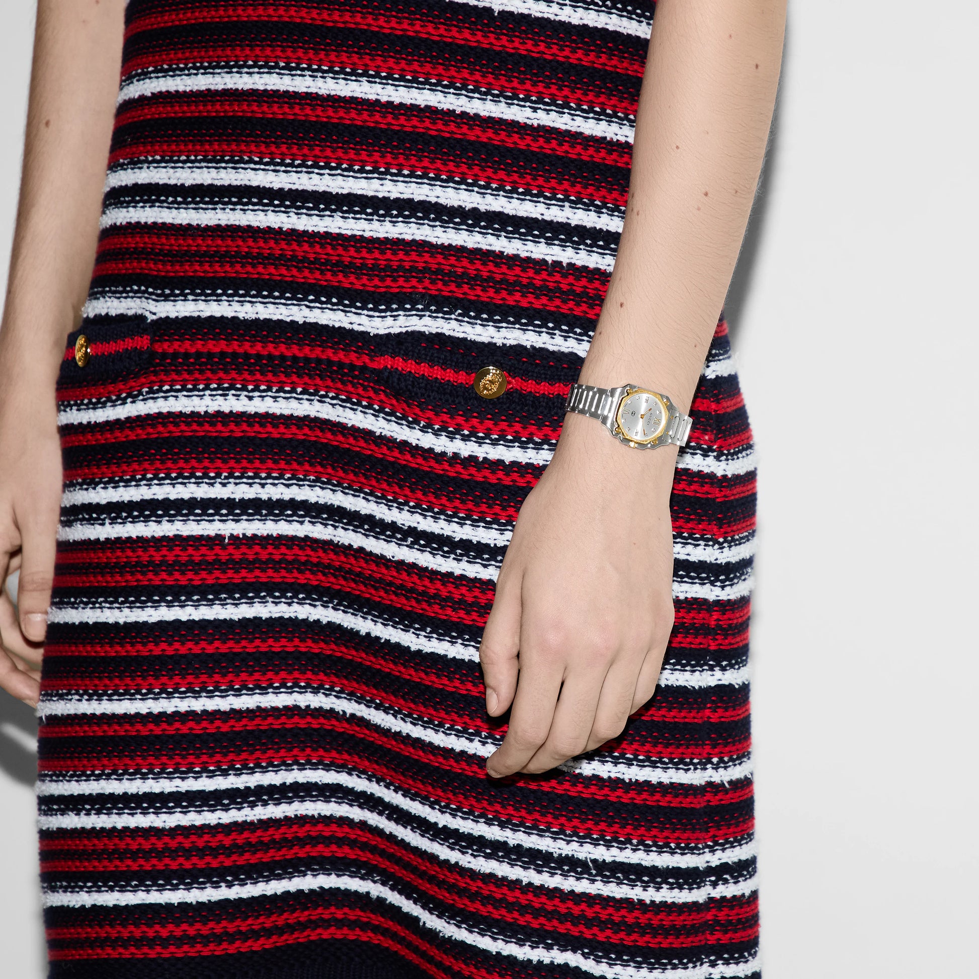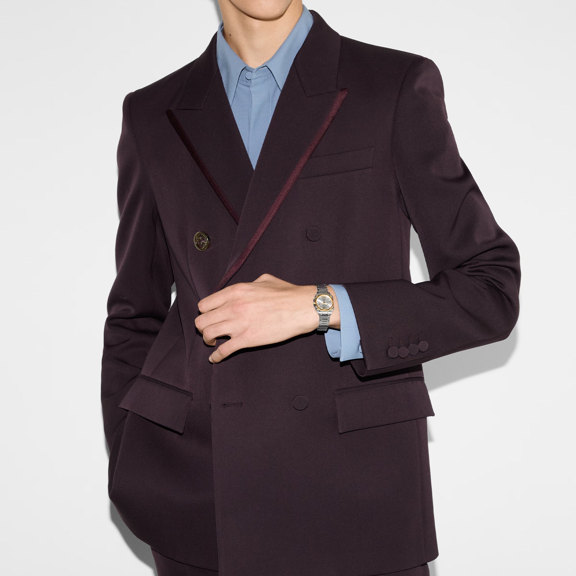 First introduced in the 1970s, the G-Flat watch pays homage to the heritage designs of the House with a modern touch. Characterized by octagonal angles and a multi-layered profile, the watch evokes the architectural landscape of the 1970s. This watch appears in stainless steel with silver galvanized dial and diamond indexes.