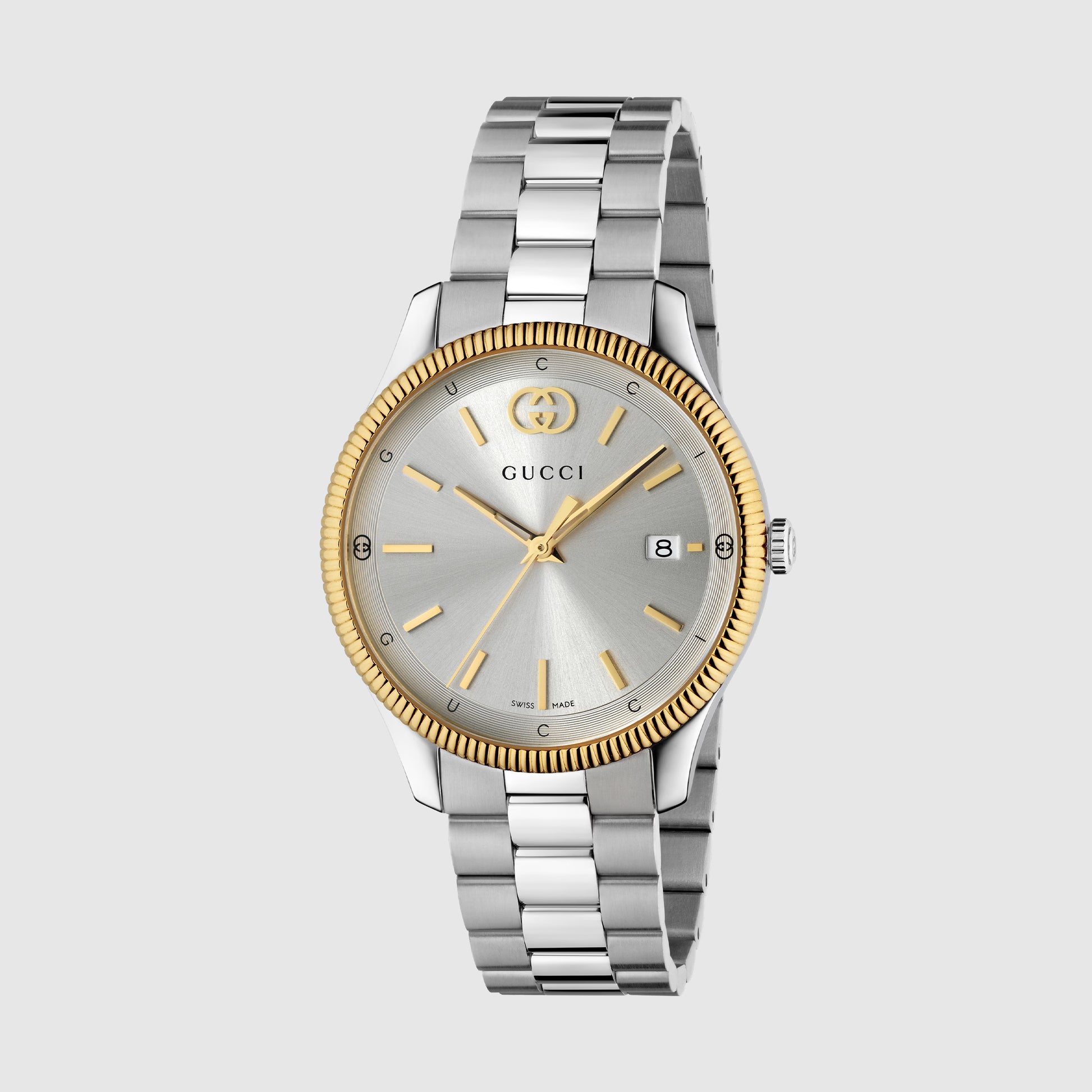 The G-Timeless line continues to define the latest collections, highlighting the signature motifs of the House. Presented with a quartz movement, the accessory features a stainless steel bracelet enriched with a silver-toned dial. The emblematic Interlocking G adds a soft logo touch to the piece.