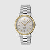 The season's polished look extends to watches and jewelry, including the G-Timeless collection. The round watch spotlights a sleek dial finish with subtle expressions of the Interlocking G, Gucci lettering, and signature motifs. Finished with a steel bracelet, the accessory is enriched with a small seconds display.