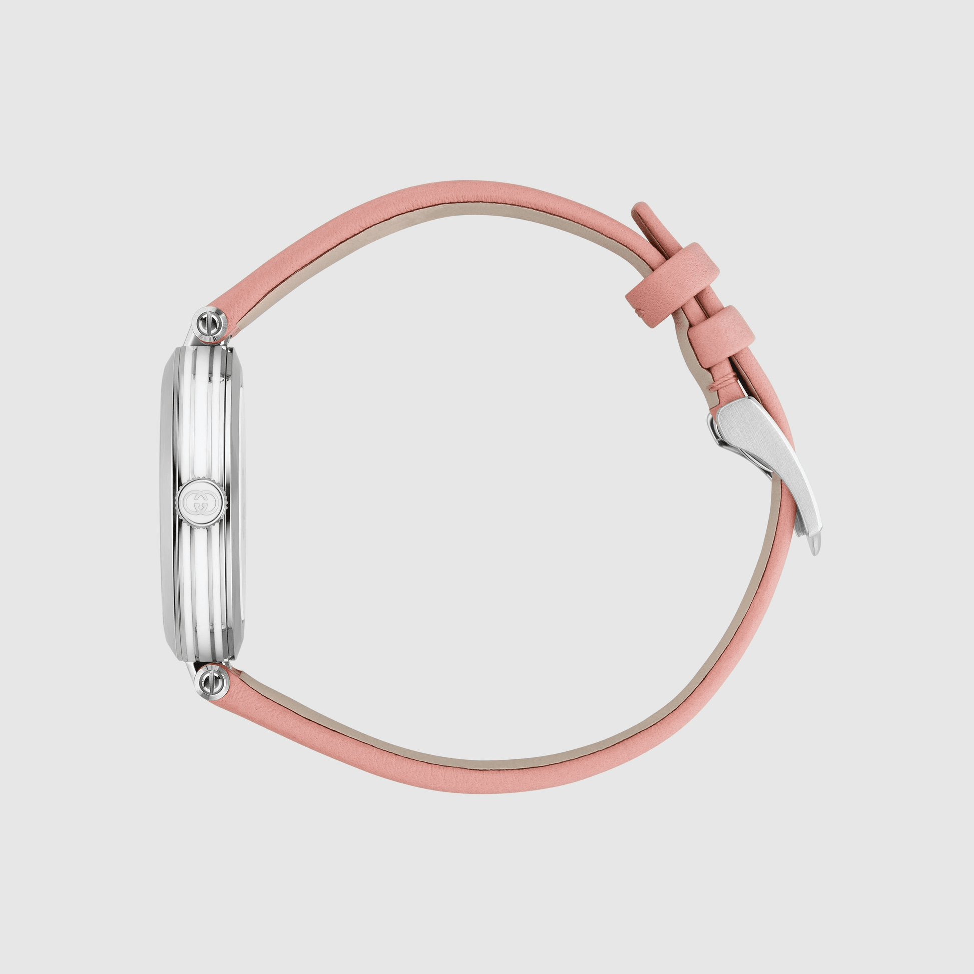 For the Cruise 2025 collection, the polished and minimalist look extends to jewelry and watches. Taking inspiration from archival codes, the Model 2000 design combines the Italian style with the Swiss craftsmanship. Presented with a pink leather strap, this watch features a silver guilloché dial, enriched with historic codes of the House.