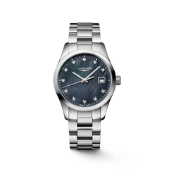 Date. Water-resistant to 5 bar, Scratch-resistant sapphire crystal, with several layers of anti-reflective coating on the underside. Black mother-of-pearl dial. Stainless steel bracelet, With triple safety folding clasp and push-piece opening mechanism.