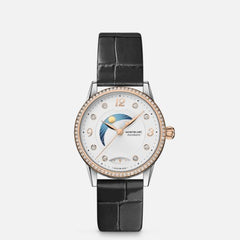 Bohème is Montblanc’s key feminine product line that interprets the codes of fine watchmaking. The product line blends simplicity with timeless design and features refined complications for today’s independent women. The Montblanc Bohème Day & Night comes in a 34 mm stainless steel case with an 18 K rose gold diamond-set bezel and a silver-white colored guilloché dial. The day/night indicator allows the wearer to know whether it is day or night just by glancing at the dial. The day is indicated by a light blue sky and gold-colored sun, while the night is represented by a silver-colored moon in a dark blue sky. This refined model features rose gold-coated numerals and hands. A black calf leather strap with alligator print completes the overall design. The Montblanc Bohème Day & Night complication is as romantic as it is practical as it can be easily adjusted via the crown without accidentally changing the date.