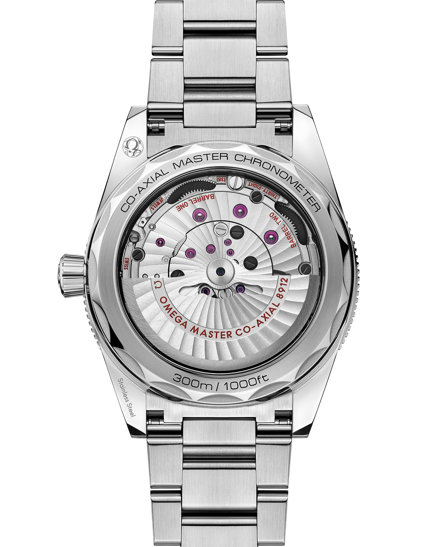 Presented on an ergonomic stainless steel bracelet, this timepiece includes a transparent sapphire crystal caseback, enabling a clear view of the OMEGA Co-Axial Master Chronometer Calibre 8912. -