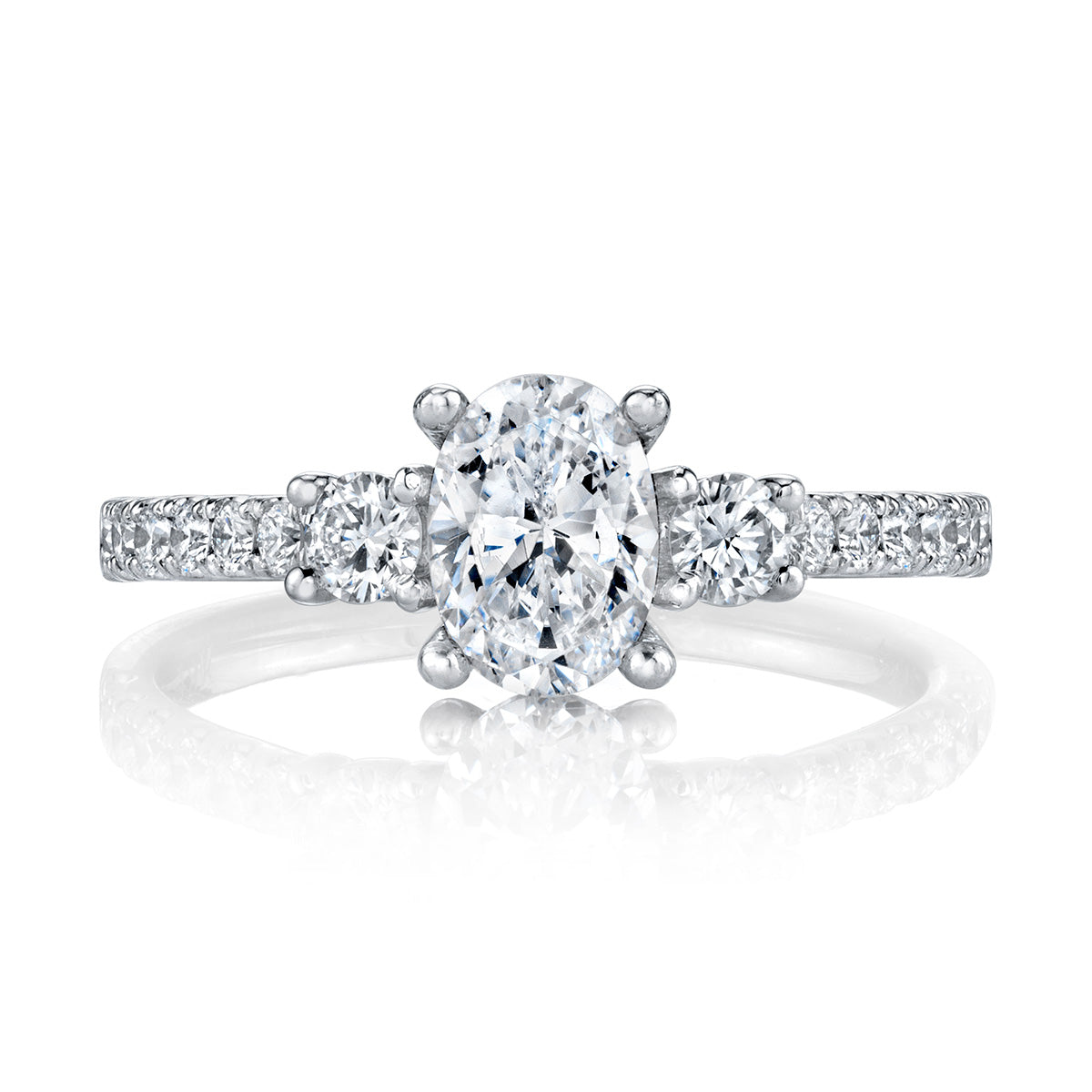 An elegant classic gets updated with a brilliant oval center set between two shimmering round side stones and a row of sparkly white diamonds.